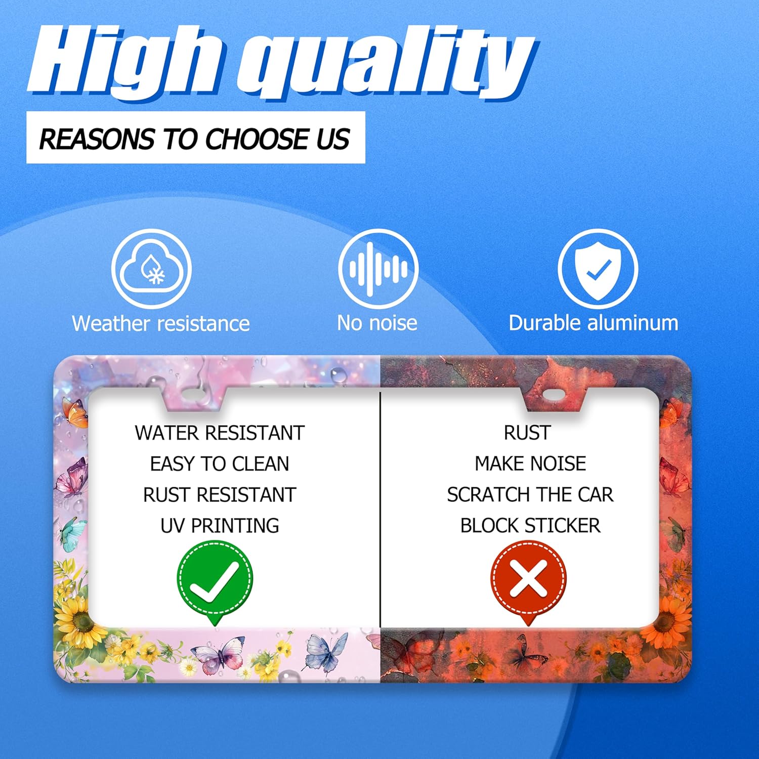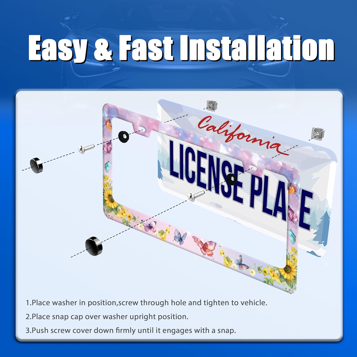 Beautiful Butterfly Sunflower License Plate Frame Yellow Floral License Plate Stainless Steel Funny License Plate Holder for Men Women Colorful Car Accessories Decoration 12.3" x 6.3"