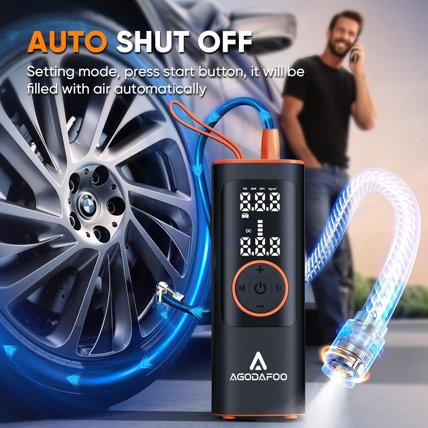 - [Two ways to inflate] : Cordless Inflatable: 12,000 mAh portable air compressor has 23.6 inches long hose allows hands-free inflation without tire angle adjustments. Also, you can connect the air pump to your car's cigarette lighter port to avoid battery drain. Road trip essential tire pump.