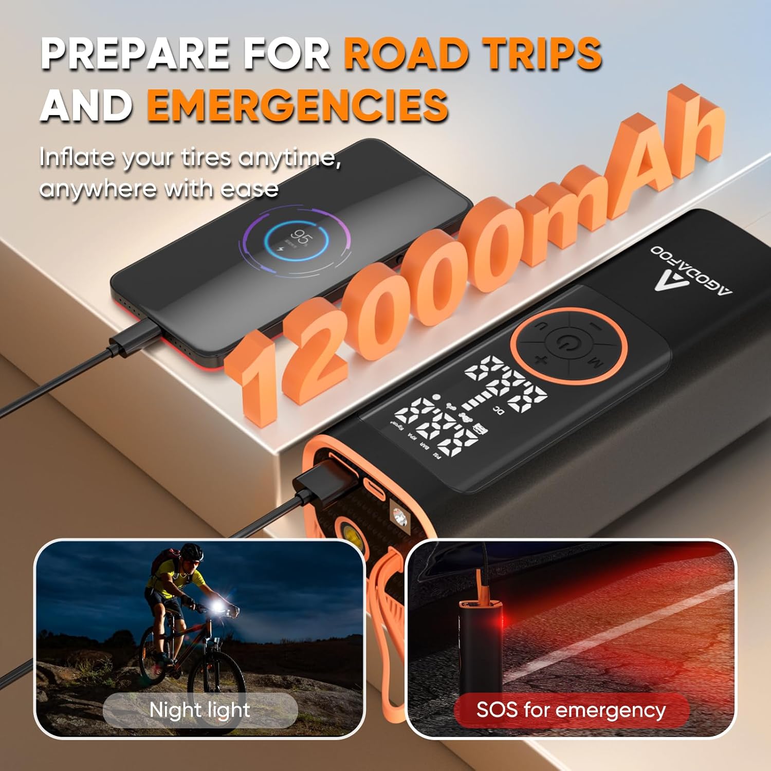 - [Multi-functional Integration] : It is not only an air compressor, but also serves as your power bank. It is equipped with two kinds of lights, high brightness LED light and SOS red light, providing lighting and emergency for nighttime traveling.