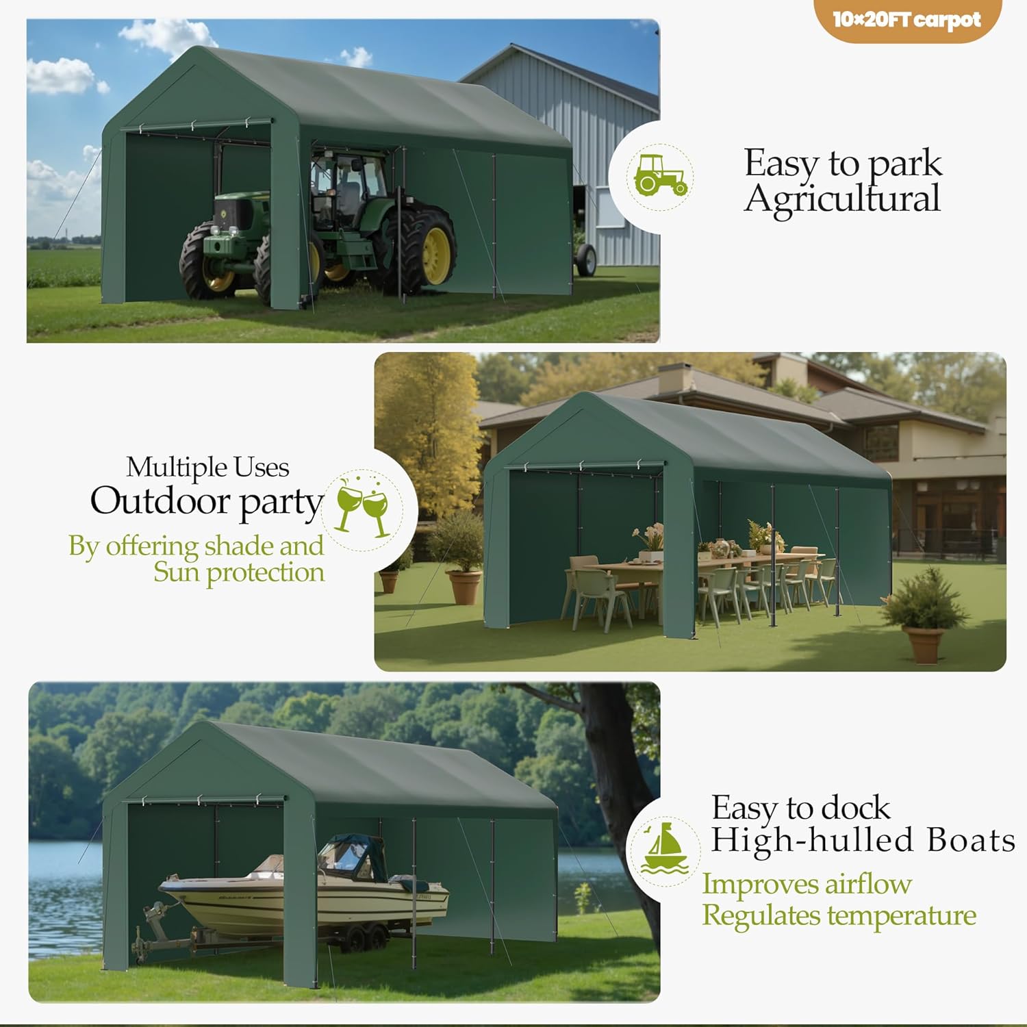 - 【UV & Weatherproof Canopy】This 10x20 carport is made of heat-sealed, triple-layer 200g polyethylene fabric, which is Anti-UV, waterproof, tear-proof, and can protect your car or boats against all four season elements, like sun, wind, rain, dust, hail, and snow.