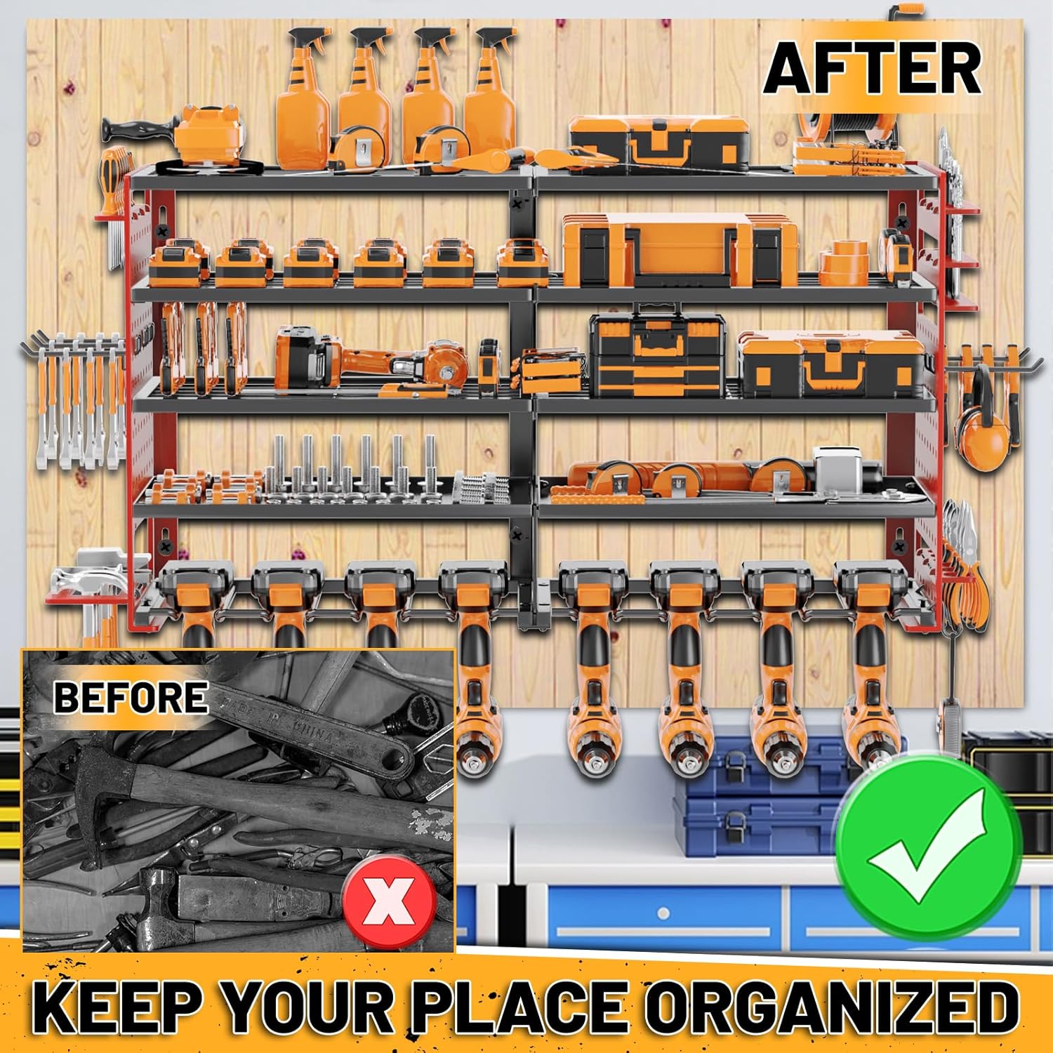 - 【Versatile Application】 The cordless tool organizer maximize vertical wall space to transform cluttered garages, workshops, studios, or workbench areas into organized, efficient zones. This multi-functional tool storage is also an excellent gift choice for men and fathers who value tidiness and efficiency