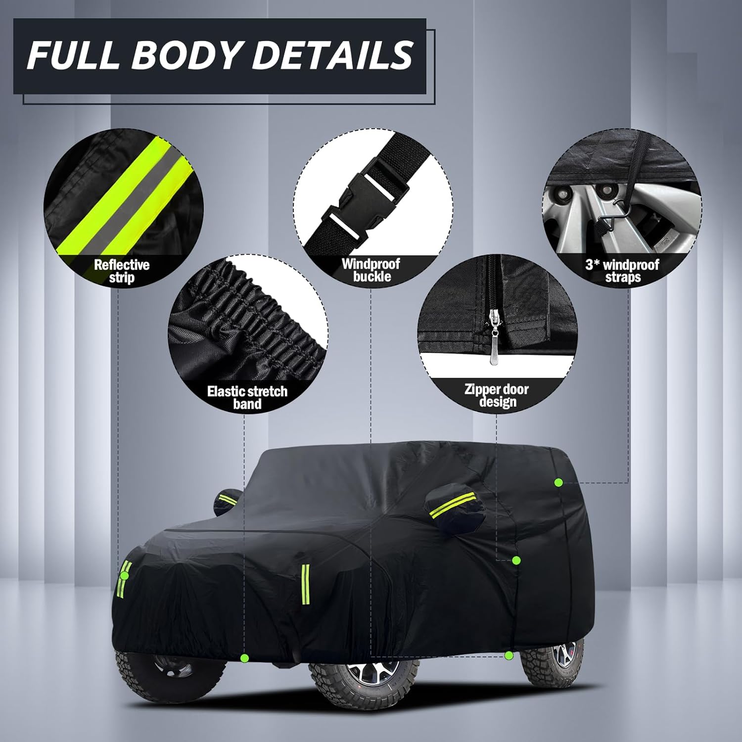 - 【All-Weather Protection】 This car cover with soft cotton lining is custom design for Jeep Wrangler 4 Door 2006-2025 JK JL. It provides comprehensive protection for the car from all-weather factors in the four seasons of spring, summer, autumn, and winter, such as dust, snow, industrial pollution, bird droppings, leaves, pollen, acid rain, ultraviolet light, intense sunlight, heavy rain, etc.