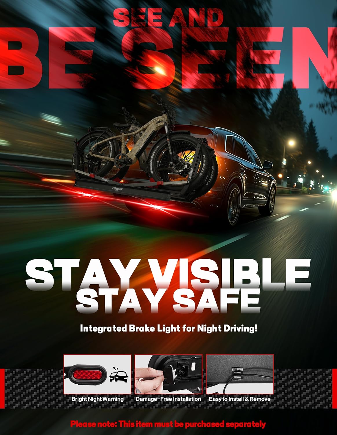 - 【User-Friendly Features】 Includes integrated loading ramp for easy bike mounting (supports heavy e-bikes) and 90° foldable design that clears your trunk space. Optional brake light compatibility (sold separately) enhances night visibility. Quick-install hitch system gets you road-ready in minutes.