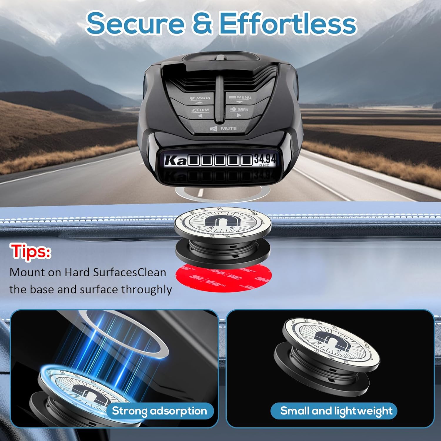 - Strong magnetic dash mount: The upgraded version of the high-strength magnetic suction ring design ,ensures that the radar detector remains firmly attached to the dashboard even on bumpy roads or sudden braking.