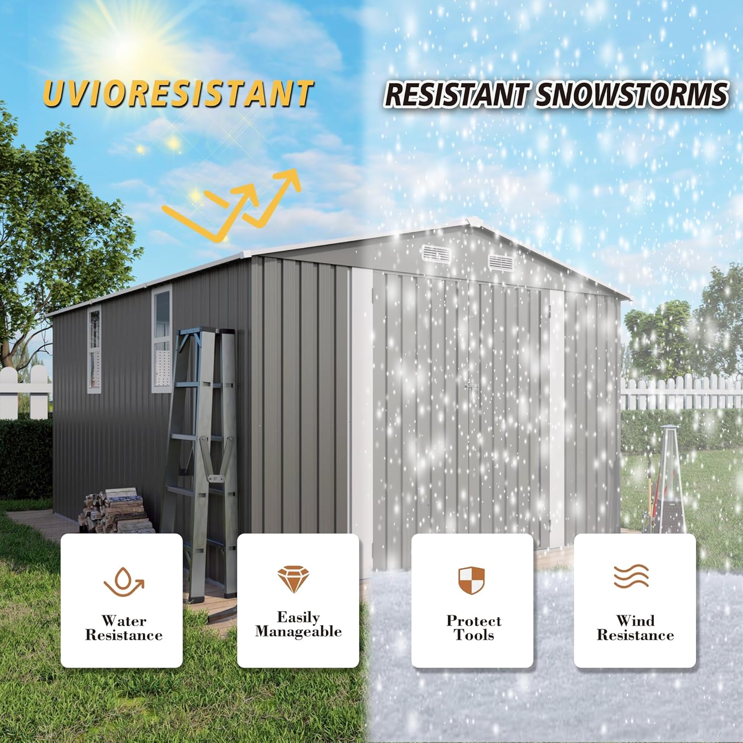 10x12x6.7FT Outdoor Storage Shed, Galvanized Steel Garden Shed with Lockable Door & Window, Waterproof Metal Tool Storage for Garden, Backyard, Patio, Lawn(Grey)