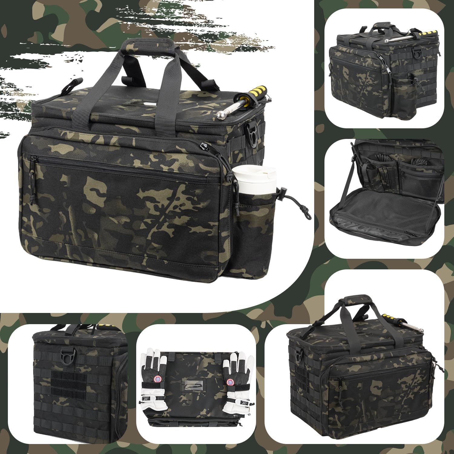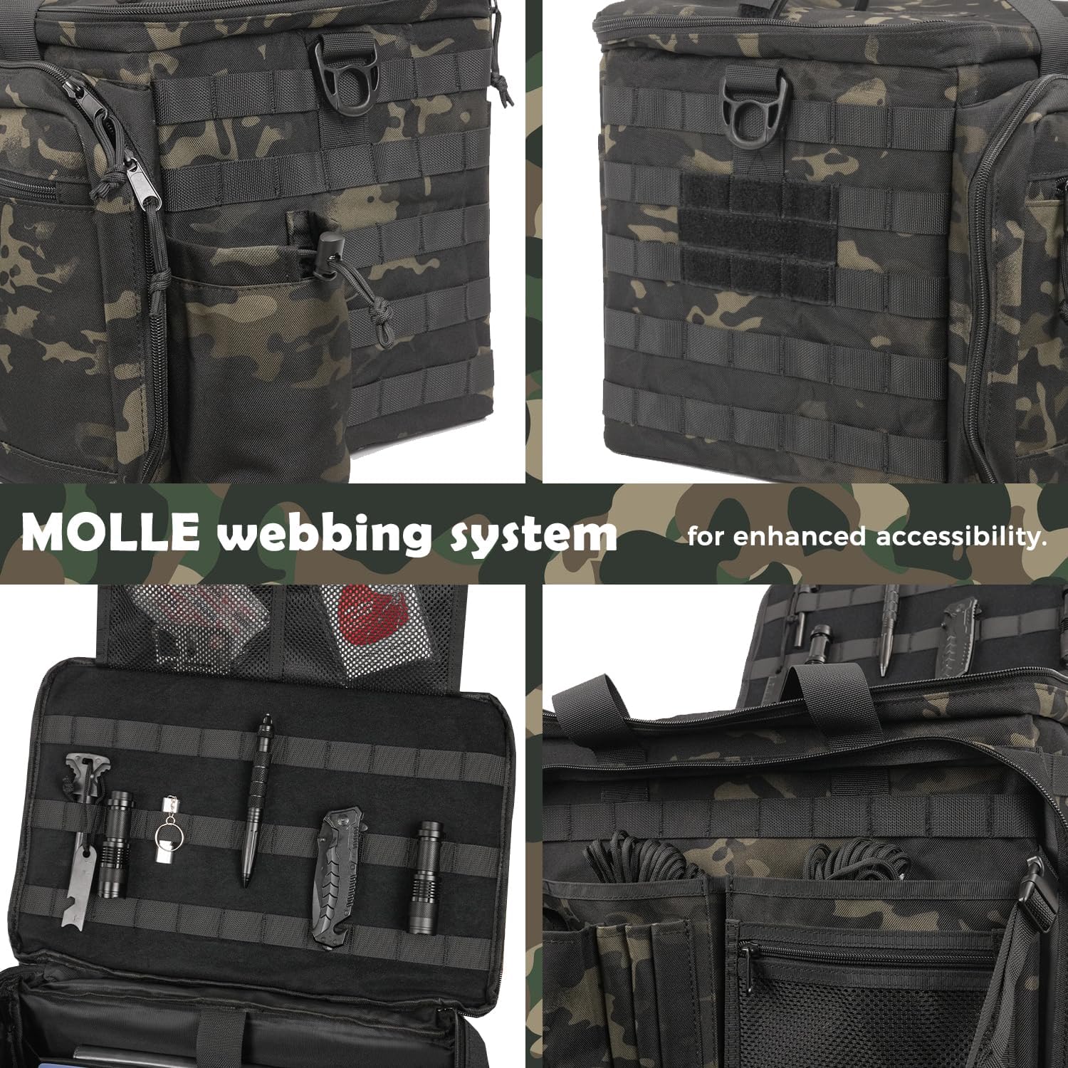 • Dedicated Work Area: Multiple compartments and pockets provide sufficient space for essentials such as tactical gear, notebooks, keys, sunglasses, gloves, ammunition and flashlights. Despite the capacity, the bag remains compact and portable, with a durable structure ensuring secure storage and easy access. Its rugged build, sturdy zippers, and thoughtful design ensure durability and practical organization.