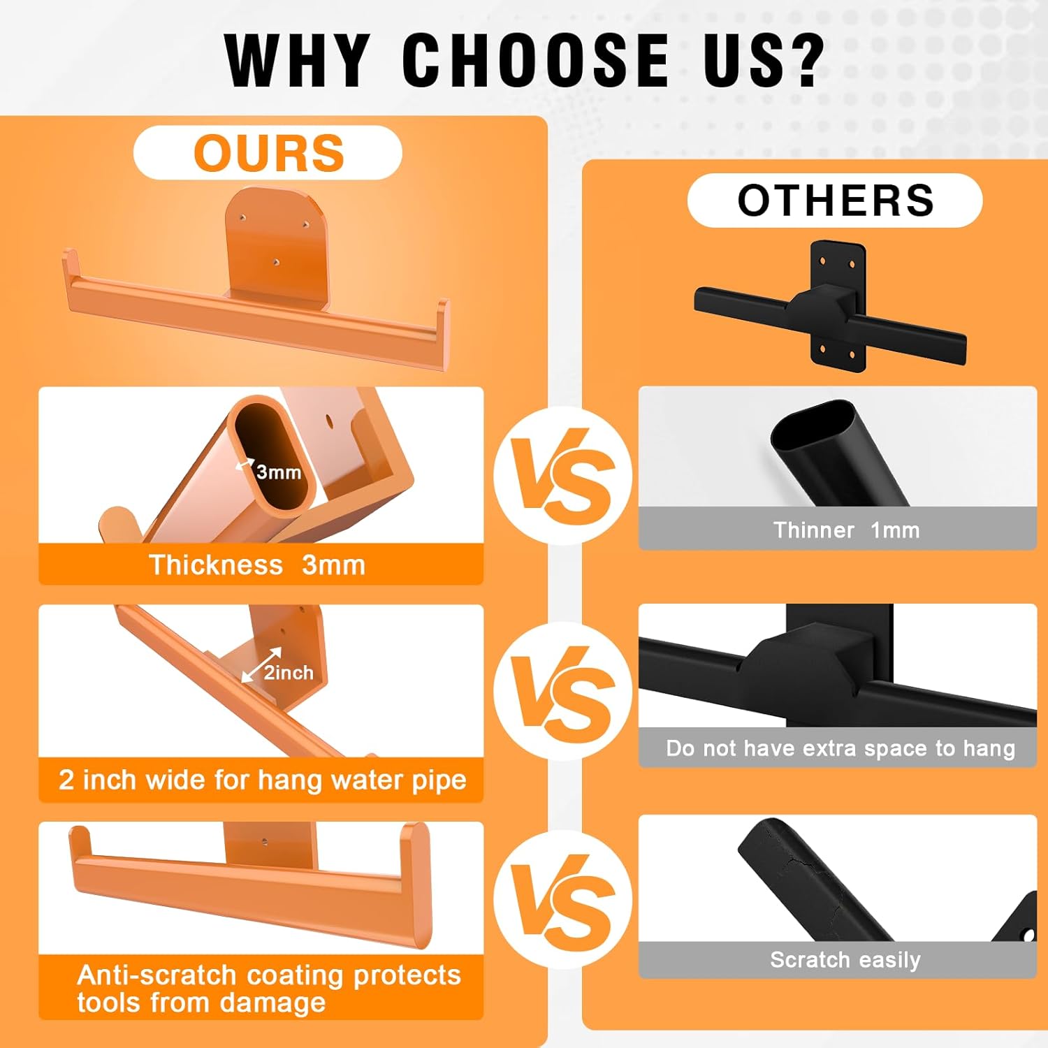 - Secure, No-Slip Design - Features a reinforced structure and triple-screw mounting system for maximum wall grip and stability. The hanger is lined with a protective coating in vibrant orange to prevent scratches, strap wear, and handle damage—keeping your tools safe and in pristine condition