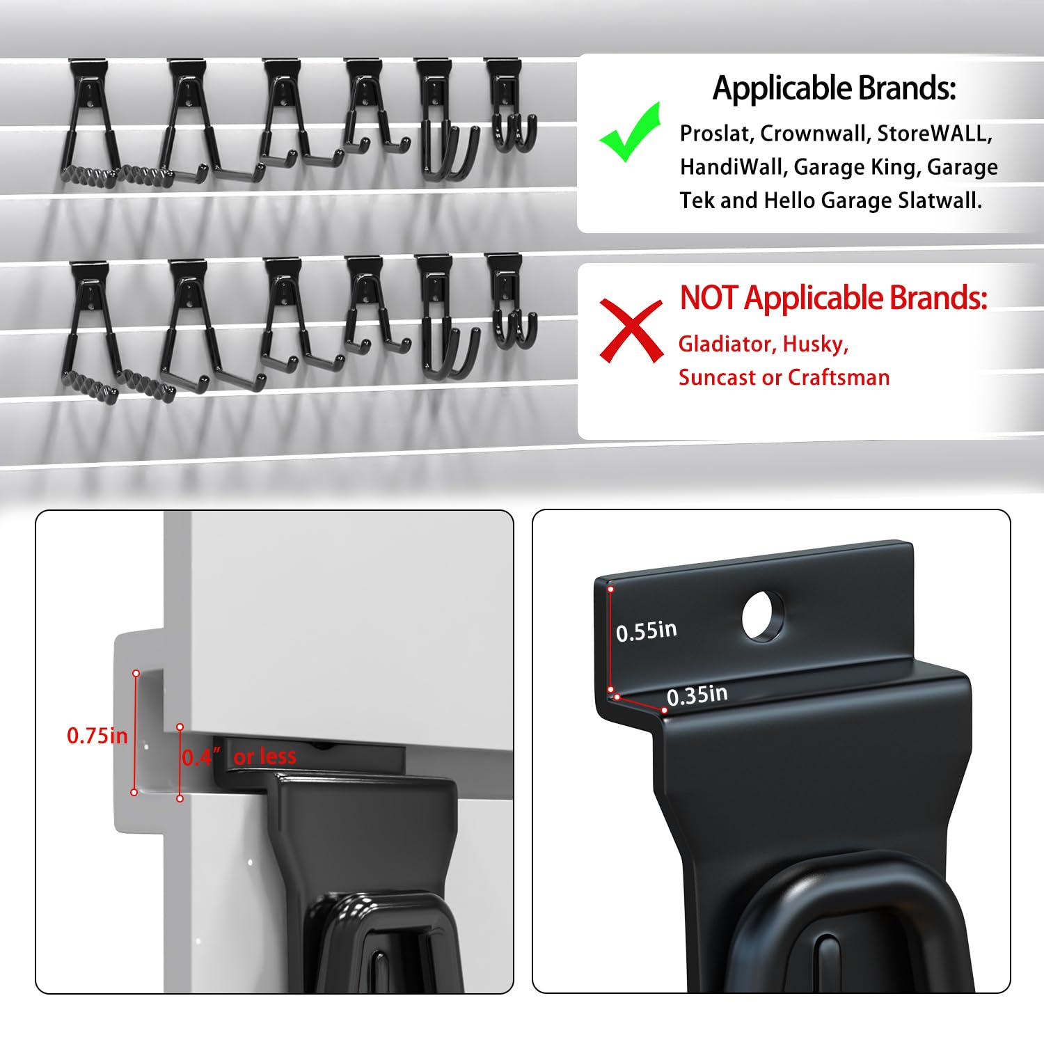 - Easy to Install and Space Saving: Slat board accessories fit standard slat wall like Proslat, Handiwall, Crownwall, etc. You can directly place storage hooks to both sides of the panel groove, fix garage hooks for hanging into the groove on the slatwall panel then press slatwall hangers down then the garage hanging hooks will fit the slat wall perfectly. Then you can move slat wall accessory to anywhere you want,saving you time and effort