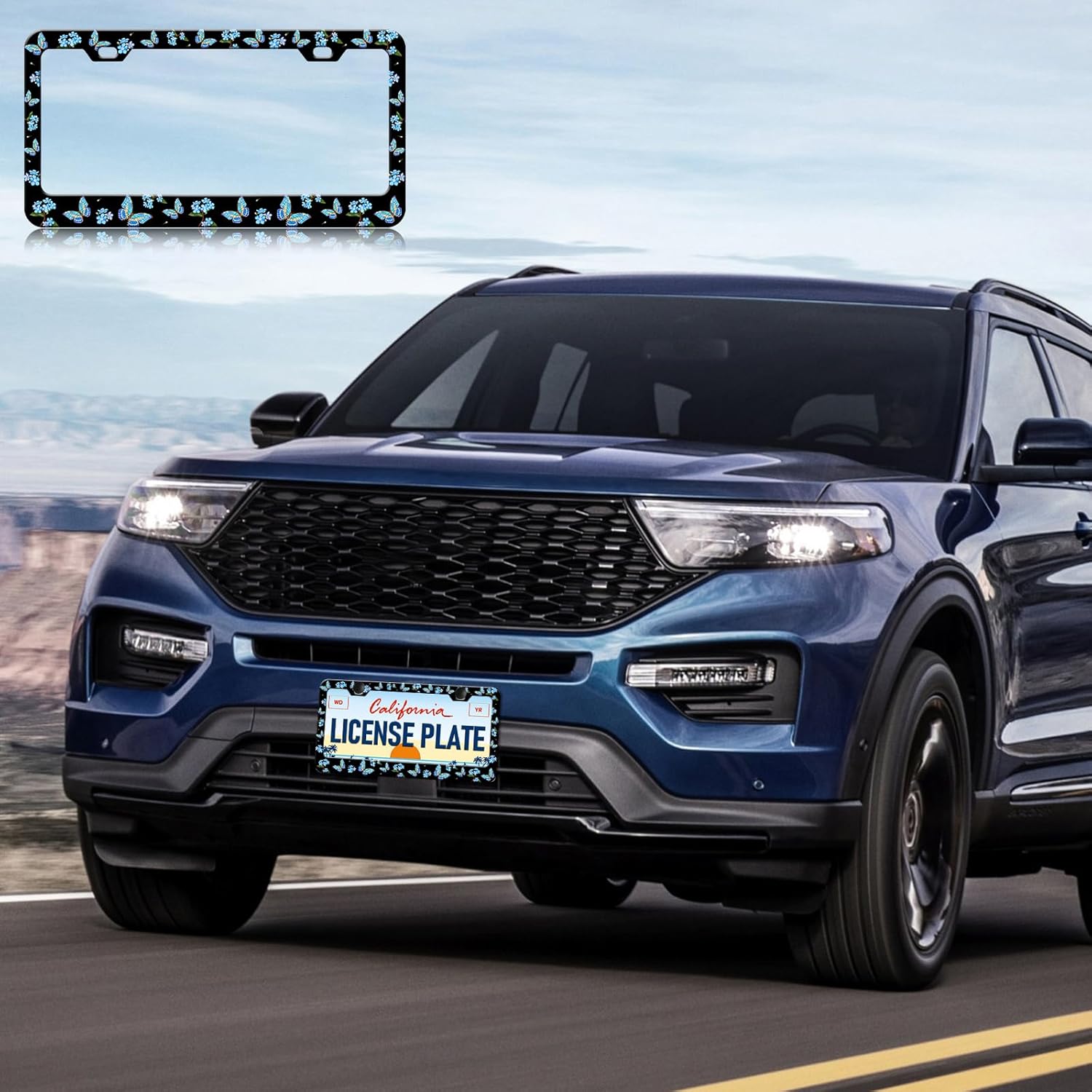 Blue Flower Butterfly License Plate Frames - 2 Pack Beautiful Butterfly Stainless Steel License Plate Holder,Rust-Proof Waterproof Car Decorative Tag Frame with Screws Fasteners Caps