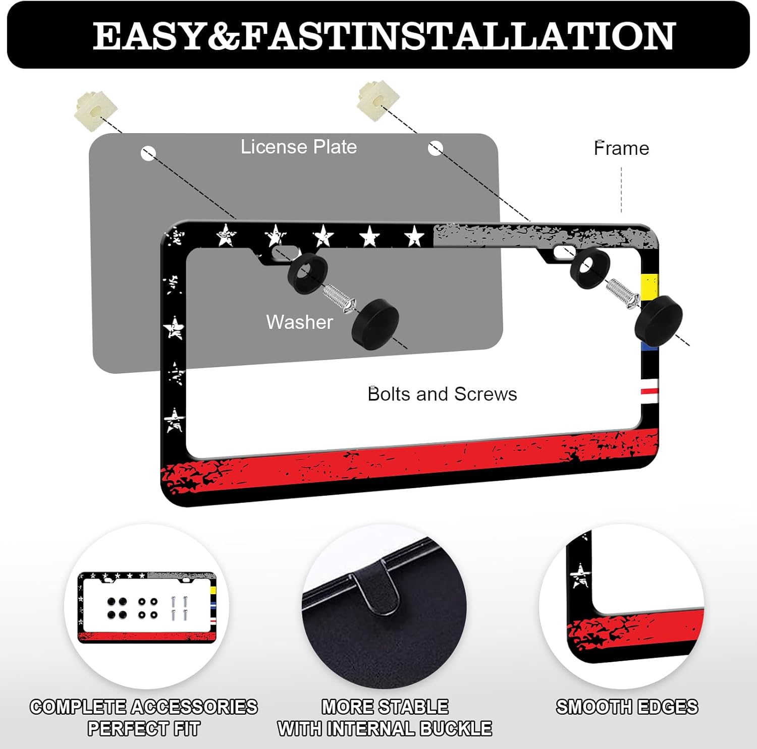 - Easy to Instal: The car license plate frame includes accessories, nuts, anti-theft screws, and comes with installation hardware, including all accessories shown in the figure;The license plate frame is easy to install without any special tools