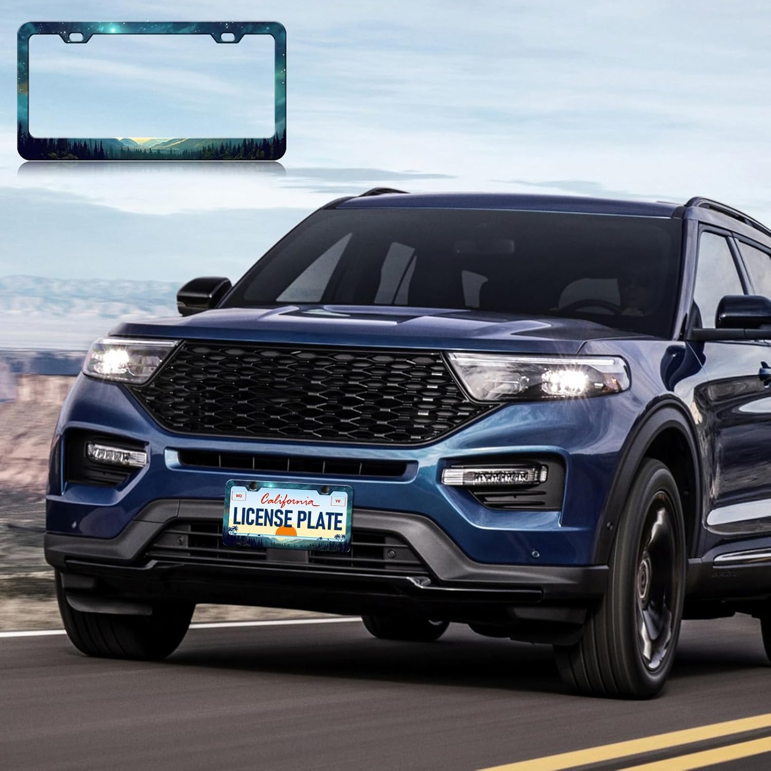 Starry Sky Mountain License Plate Frames - 2 Pack Green Mountain Forest Stainless Steel License Plate Holder,Rust-Proof Waterproof Car Decorative Tag Frame with Screws Fasteners Caps