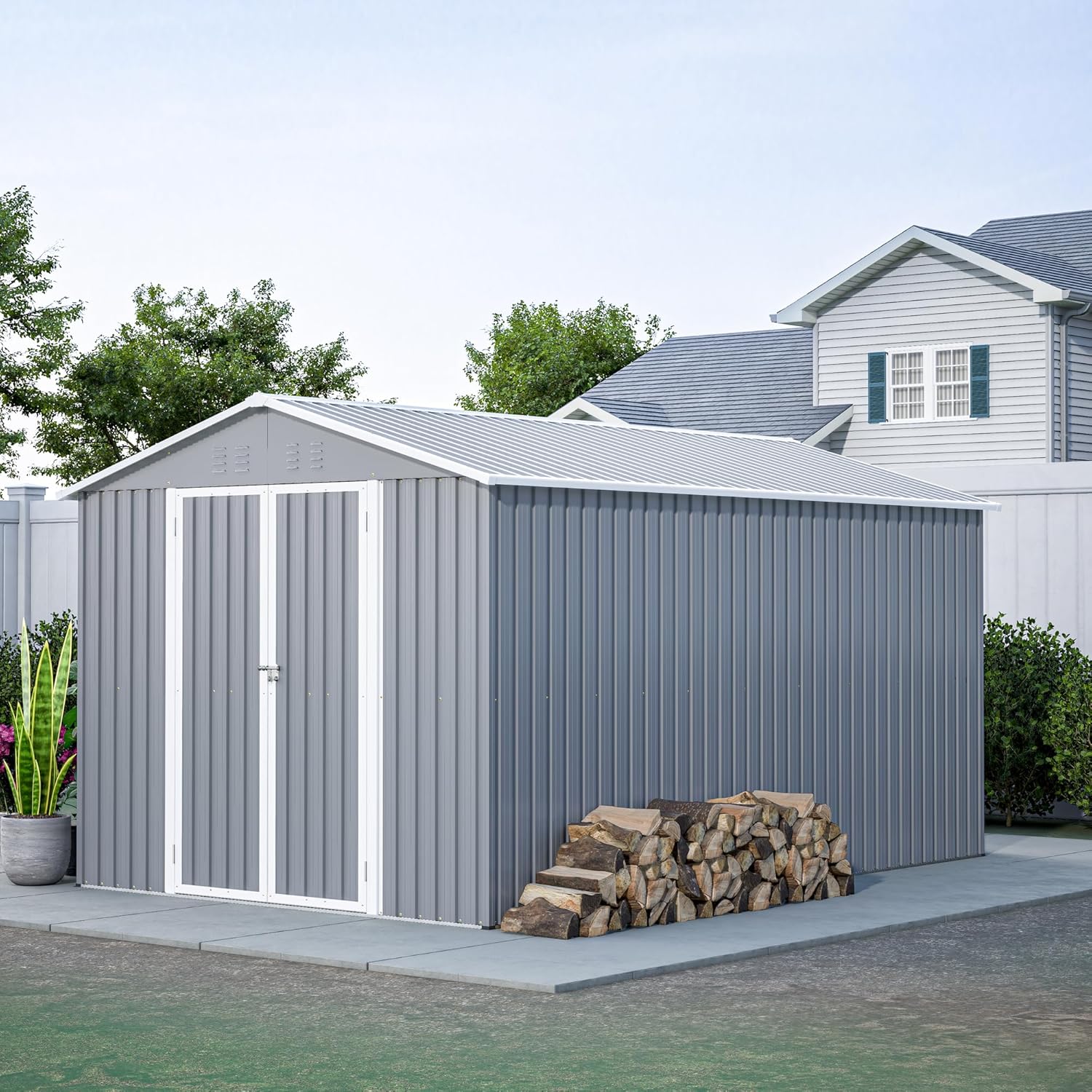8x12 FT Outdoor Storage Shed,Metal Shed W/Floor,Garden Storage Shed W/ 1 Lockable Hinged Door,All Weather Waterproof Tool House W/ 2 Air Vents & Sloped Roof,for Backyard,Patio,Lawn,Gray