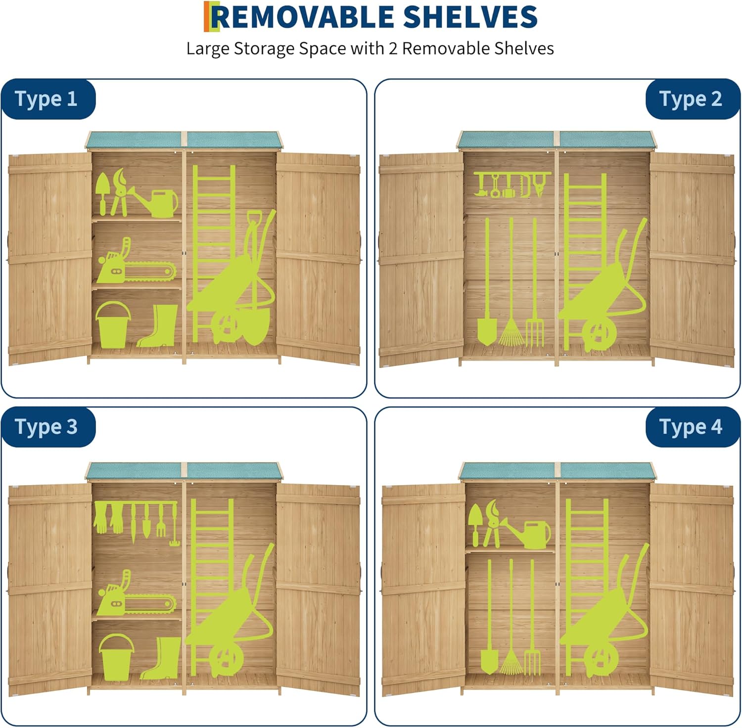 - 【Flexible Interior with Removable Shelves】Equipped with two adjustable shelves and a deep bottom compartment, this garden storage shed easily adapts to your needs. Store everything from small hand tools to tall items like rakes, shovels, or brooms with ease—perfect for organizing both bulky and compact items.