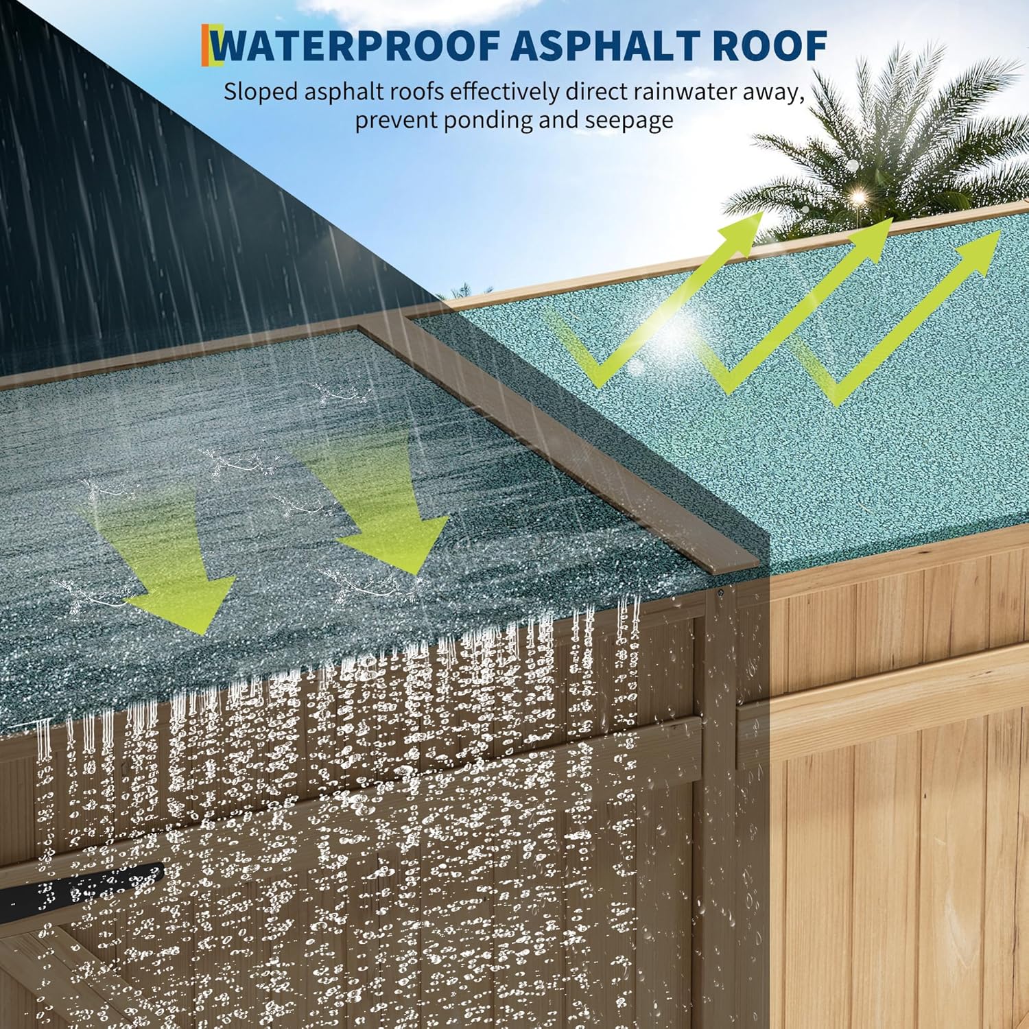 - 【Weatherproof Sloped Roof Design】Built with a slanted asphalt roof, this outdoor storage cabinet provides effective rainwater drainage and all-weather protection. It helps safeguard your belongings from moisture, extending the life of both the shed and its contents—ideal for year-round use.
