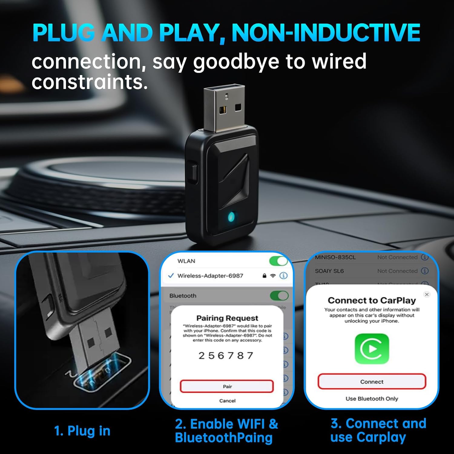 - 【Plug and play】 non-inductive connection, say goodbye to wired constraints.Instantly upgrade your factory-wired CarPlay to wireless while preserving your car’s original touchscreen and knob controls. Enjoy hands-free access to Siri, calls, Maps, Spotify, Messages, and more - all without the clutter. Cut the cords and drive smarter!