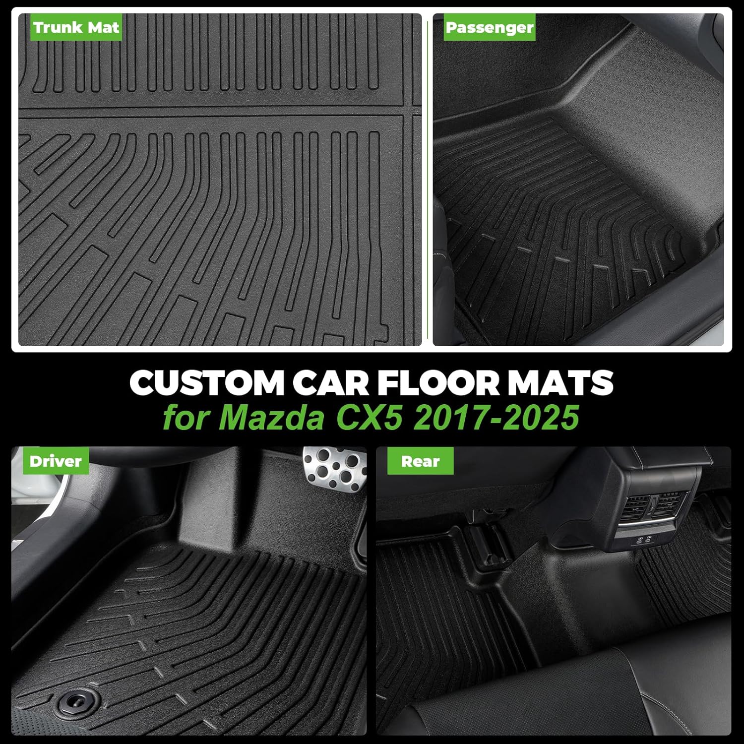 - 【Precise Fit】Suitable for Mazda CX5 2025 2024 2023 2022 2021 2020 2019 2018 2017,all-weather floor mats and cargo mats. Through 3D laser sanning technology, accurately cover your car carpet and fit your car like a glove. During the design process, attention was paid to details such as throttle and brakes, which will not affect your driving experience.
