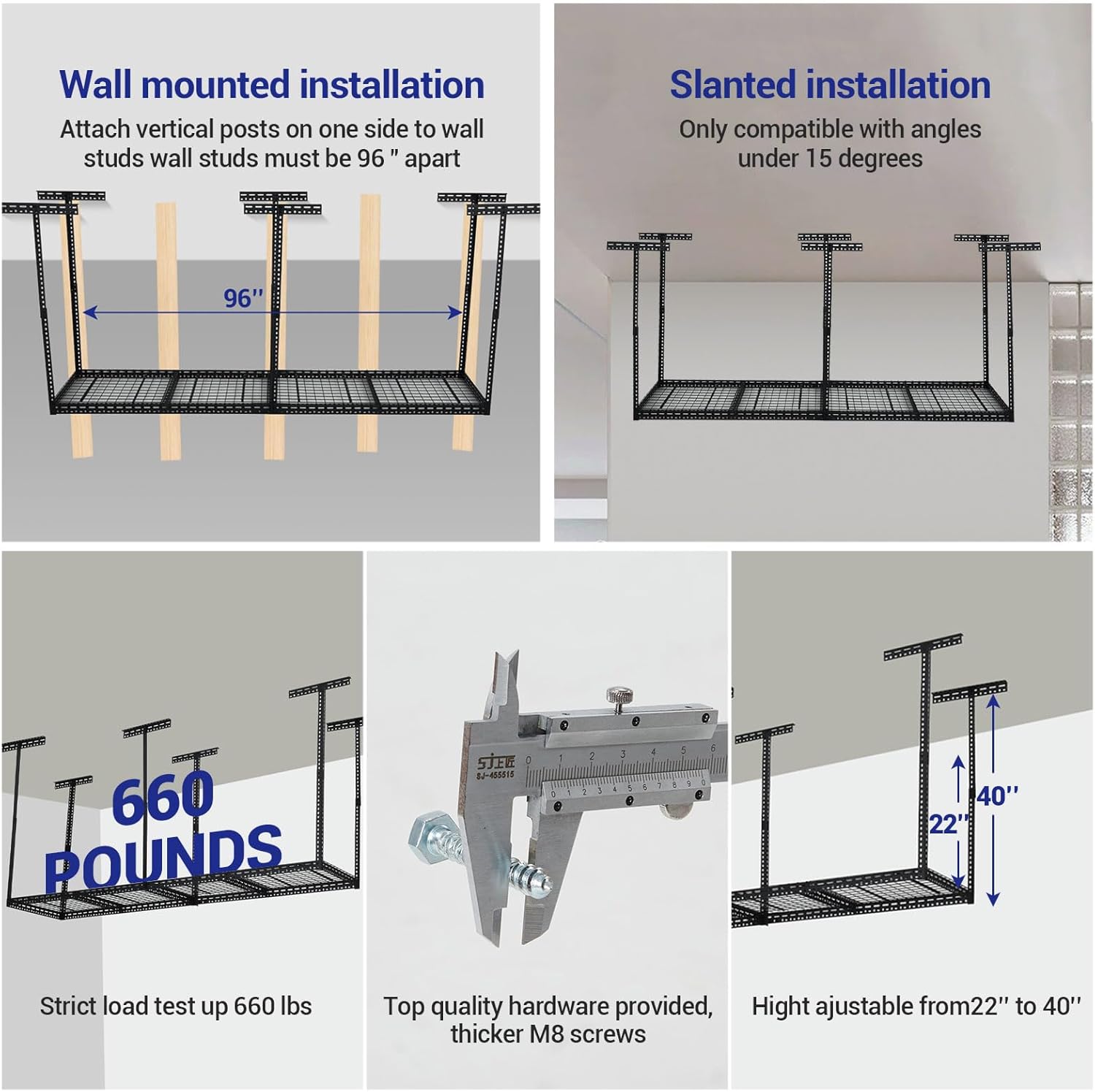 - ✅ Versatile Height Adjustment (22"-40"): Customize your overhead storage rack to fit any ceiling height or storage need. Easily adjust from 22 to 40 inches to maximize vertical space, accommodating tall items in your garage or clearing obstacles in low attic areas. Perfect for seasonal gear or bulky supplies.