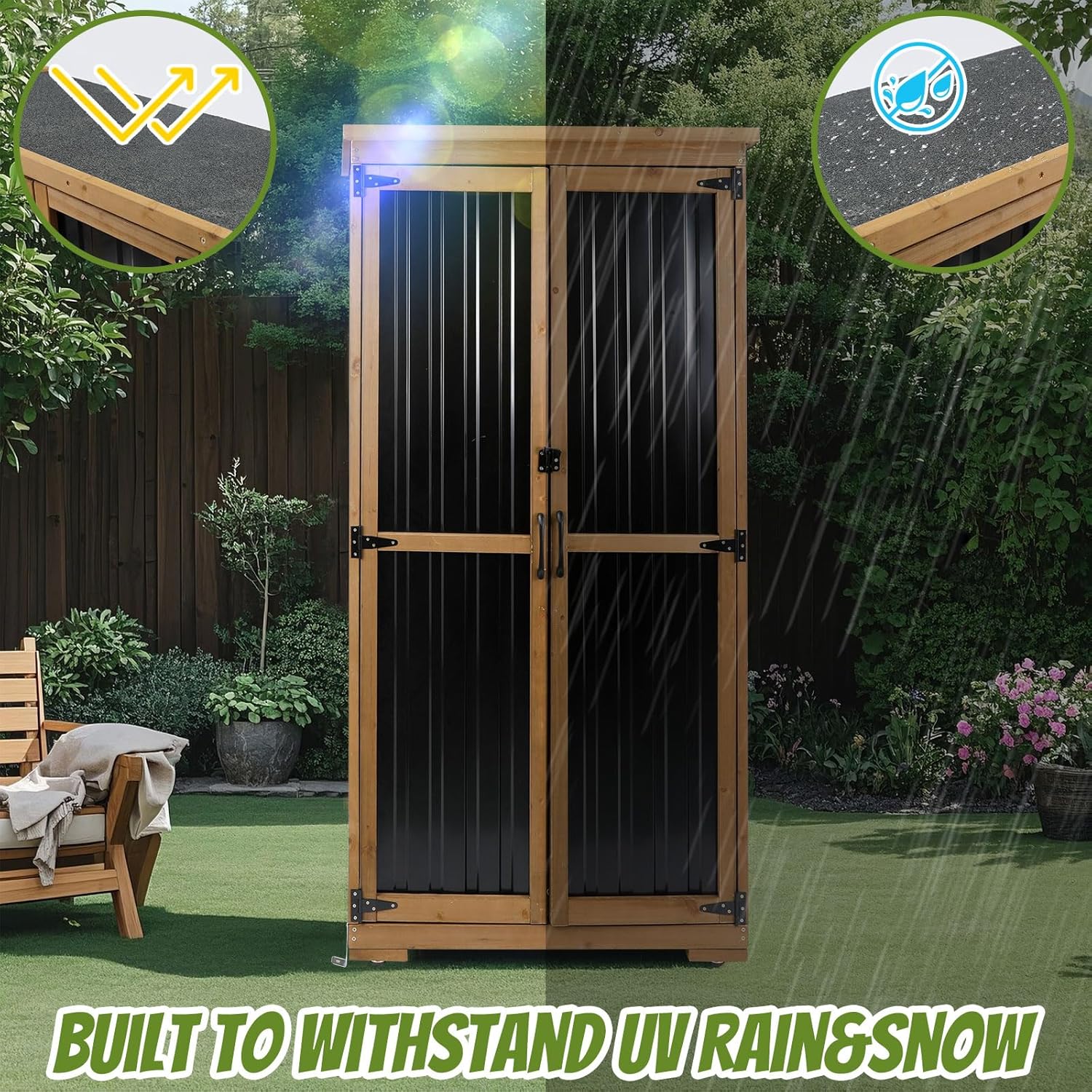 Outdoor Storage Cabinet Weatherproof,Wood & Metal Storage Shed with Adjustable Shelves & Lockable Doors,Vertical Outdoor Cabinets for Backyard Patio, Gardening Tools and Accessories,Brown