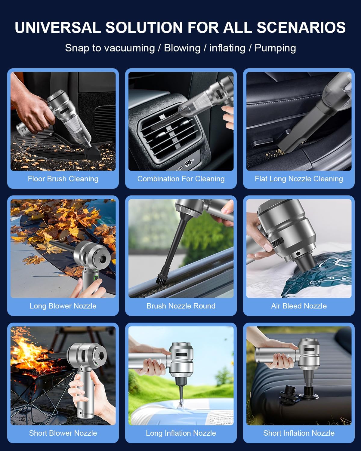 - 【4-in-1 Multi-function】VNOST S7 Pro wireless handheld car vacuum cleaner strong suction is equipped with nine nozzle attachments that combine vacuuming, blowing, inflating and extracting functions. Whether you need to clean your car's interior, inflate your swim ring, or perform vacuuming to extract air, this car vaccum will meet your needs.