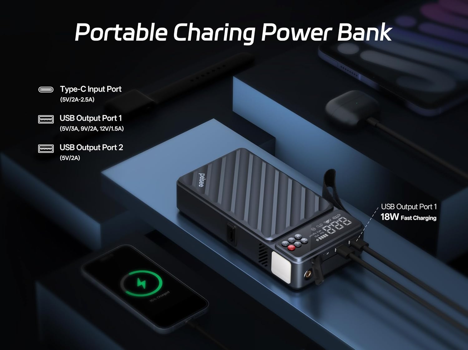 - 12 Safety Protections & 18W Fast Charge- Equipped with two output ports(USB Output Port 1-18W), Portable car battery jump starter can charge various electronic devices efficiently. 12 safety protection(Spark protection,reverse polarity etc)and multiple safety warnings provide greater security for your journey (Note: When the internal temperature reaches 95℃ during inflation, it will enter overheat protection and shut down. Please wait for it to cool down before continuing to use it)