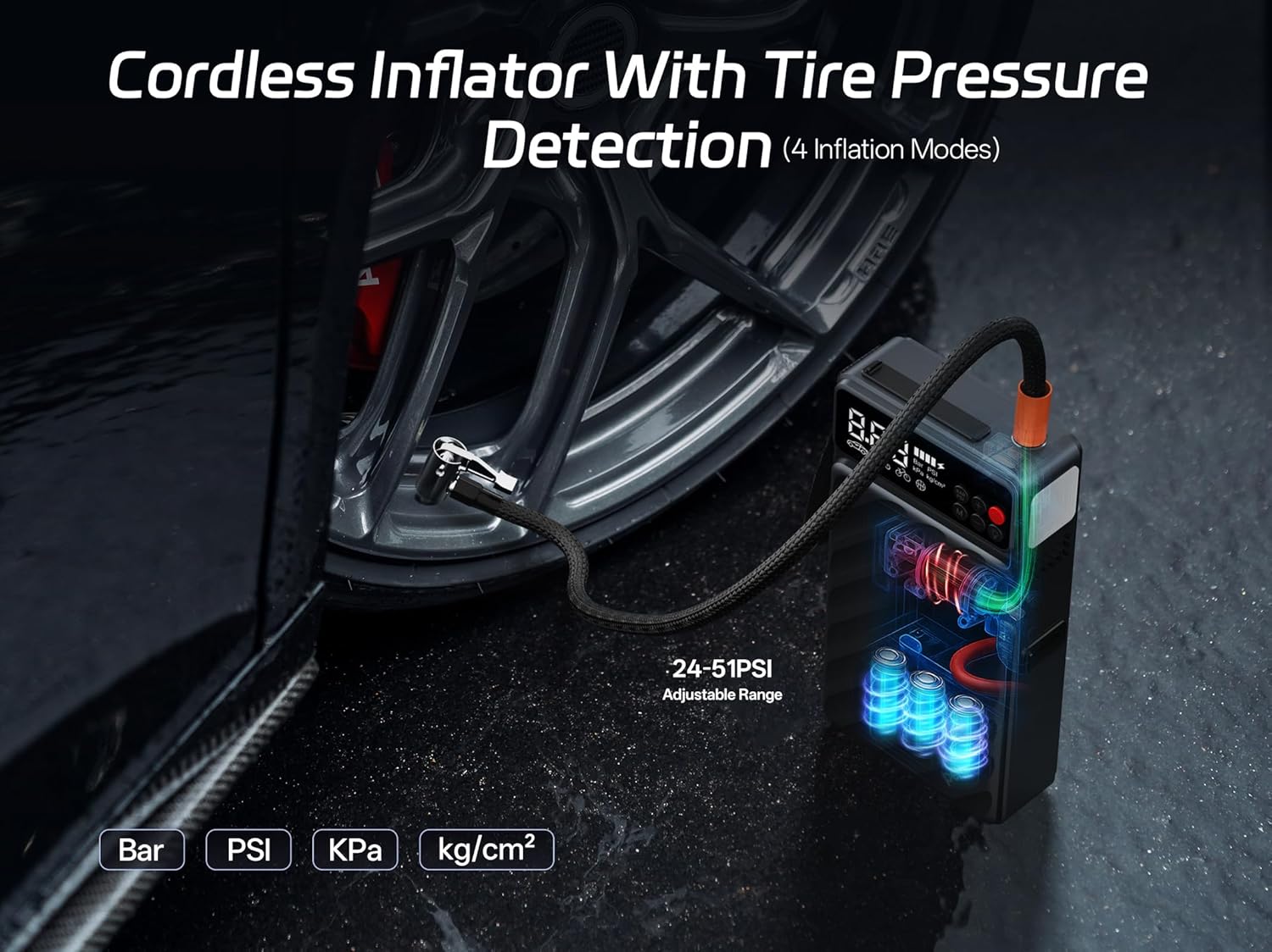 - Jump Starter with Air Compressor- Equipped with a 160PSI high-efficiency turbocharger system. Supports intelligent detection of tire pressure and automatic shutdown after 30 seconds of static rest. Equipped with 4 inflation modes(Bar,PSI,KPa,kg/cm²), making quick work of insufficient tire pressure