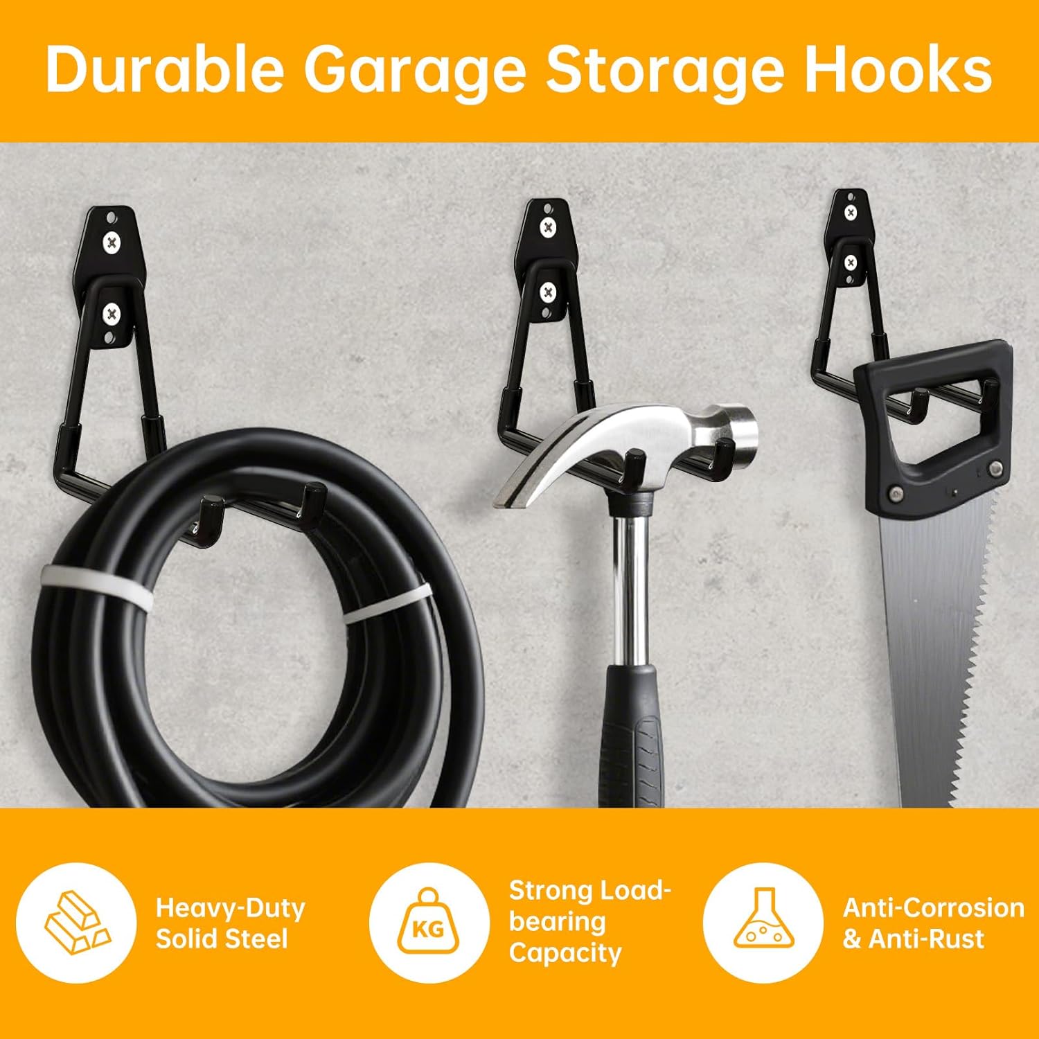 - 【Heavy-Duty Load Capacity】Engineered with reinforced steel construction, these Heavy Duty Garage Hooks support a large load capacity per hook, providing ultra-strong storage for ladders, hoses, and bulky equipment without bending or warping.