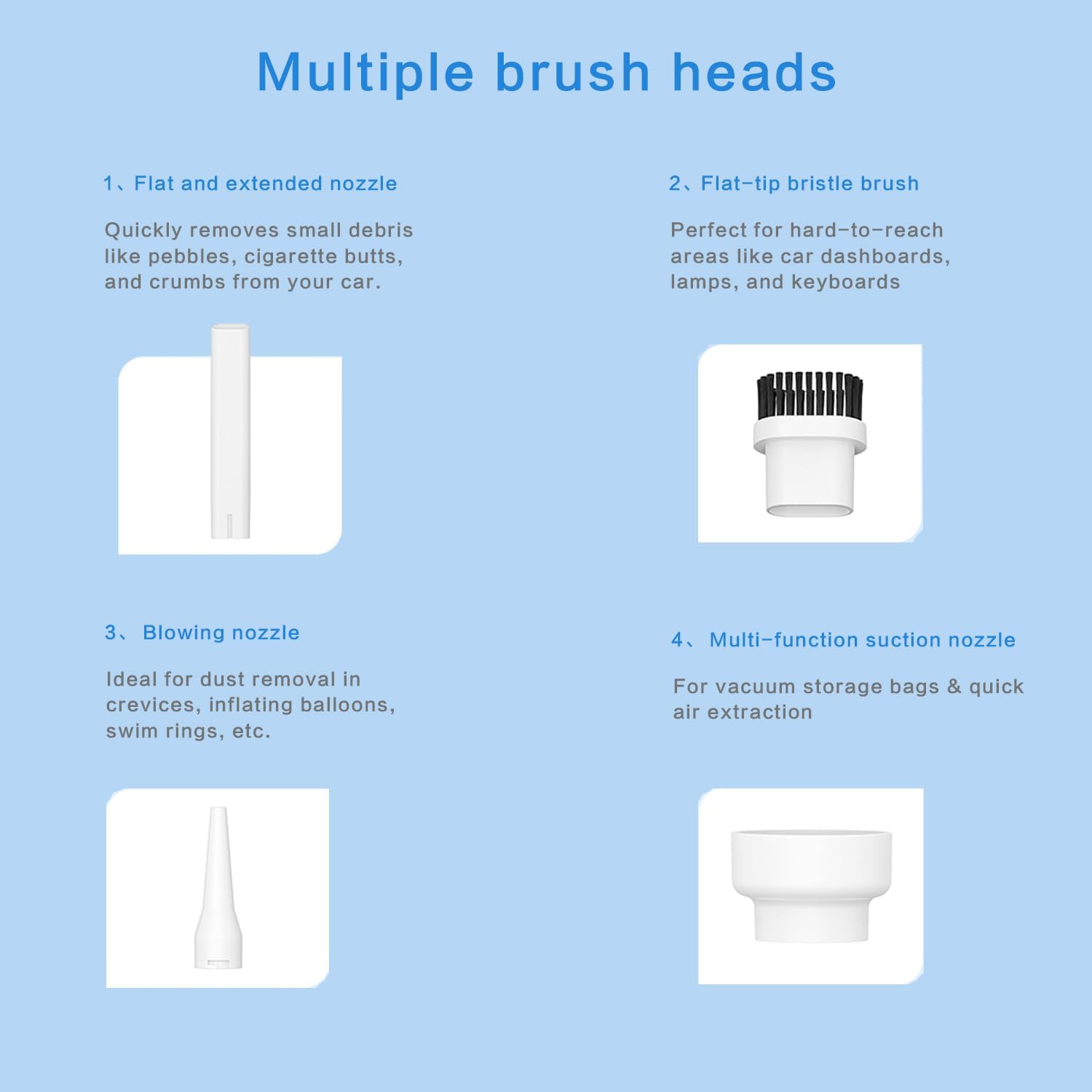 - 【Multi Functional】4 attachments of hand vacuum specifically designed for vacuuming&pumping and blowing, clean the garbage in the corners and gaps, pump air from the vacuum storage bag, inflate the air cushion.