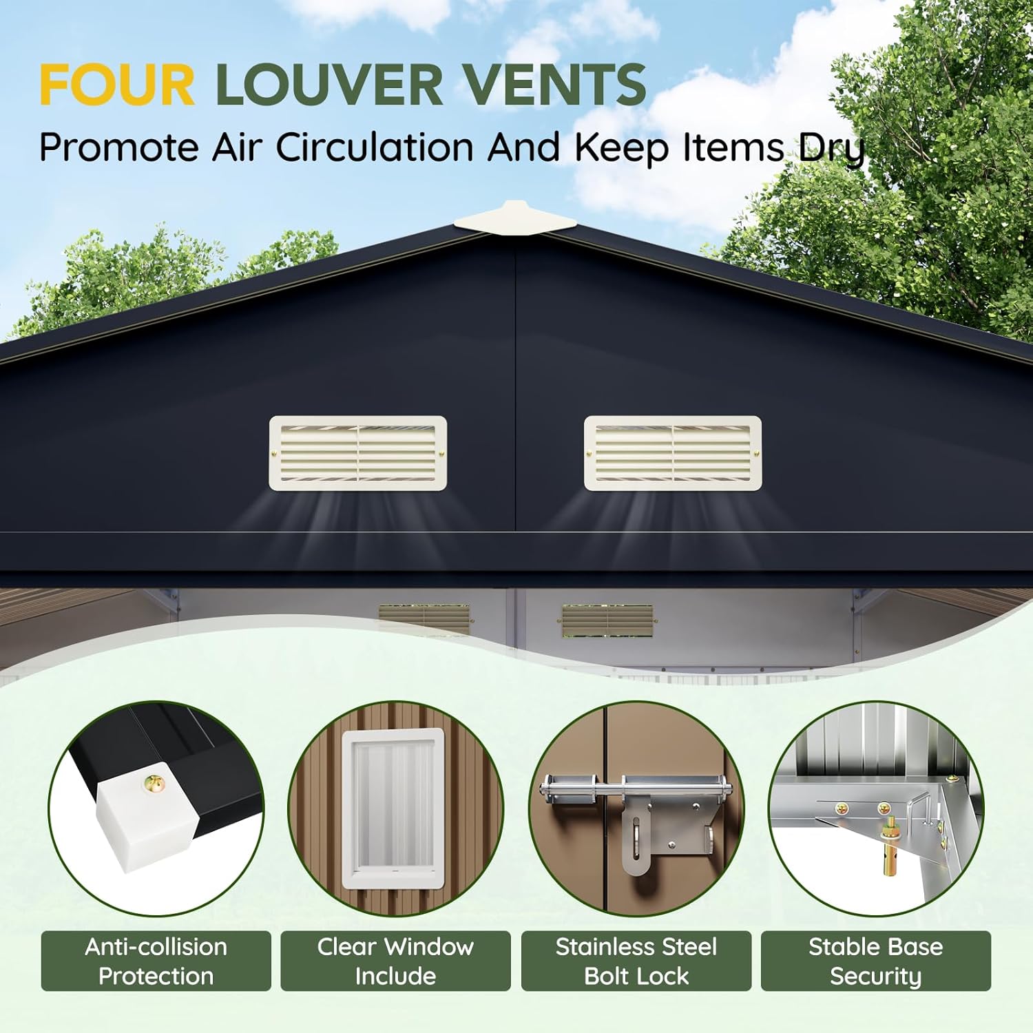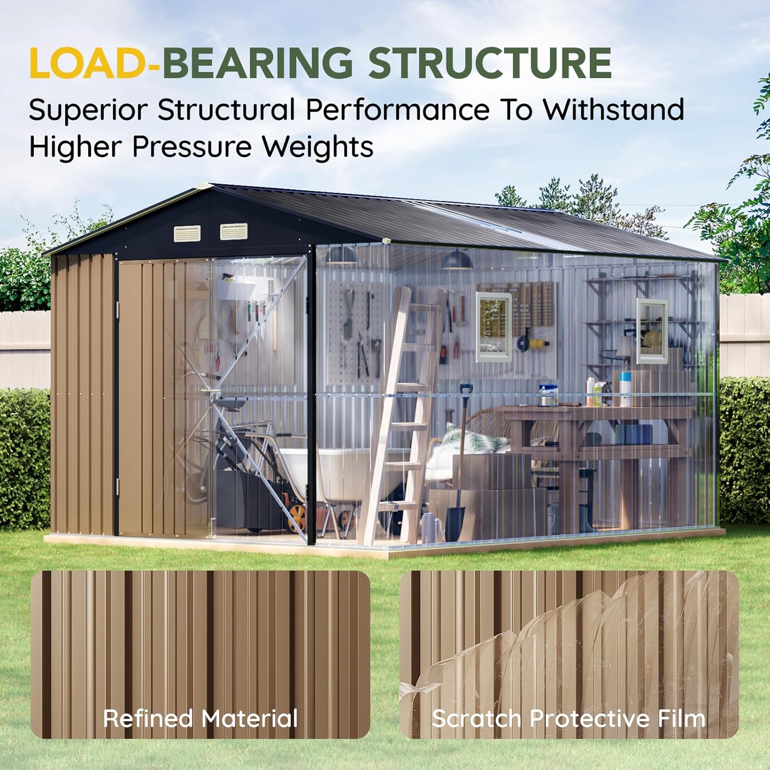 - Durable Construction: Crafted from galvanized steel, this shed is rust-resistant and weatherproof, ensuring long-lasting durability even in tough outdoor conditions.