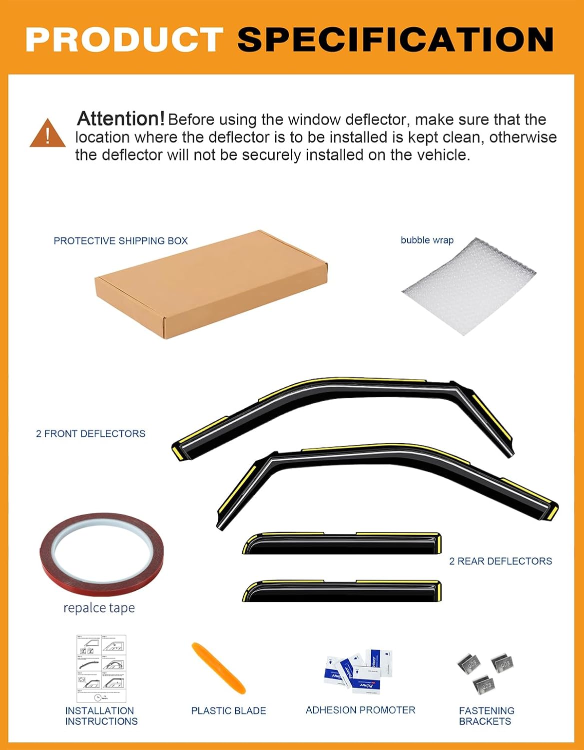 - 【Full-size Side Window Deflectors】This 4-piece set includes passenger, driver side rain guards that create a seamless look that protects you from sun rays, rain drops, and wind while you’re driving with the window down.