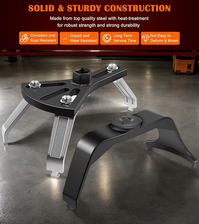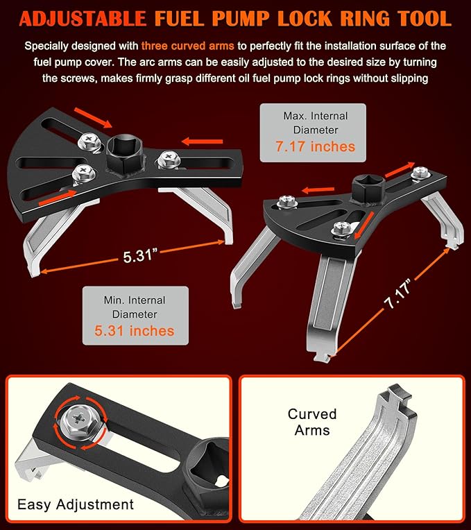 - 【Adjustable Fuel Pump Lock Ring Tool】Specially designed with three adjustable arms with a large adjustment range from 5.83 inches to 7.83 inches. The diameter of the arms can be easily adjusted to the desired size to fit different size of the oil fuel pump locking rings by turning the screws. In additional, the arc legs match the mounting surface of the fuel pump cover for a customized fit and better grip during removal and installation.