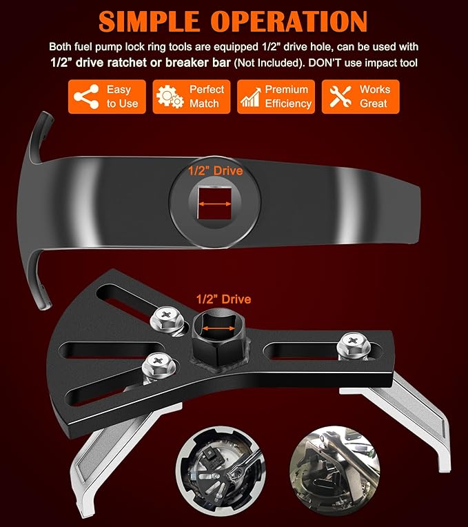 - 【Package Includes】1 x 5.31" to 7.17" Adjustable Fuel Pump Lock Ring Tool and 1 x 6695 Fuel Tank Lock Ring Tool. Both tools are can be used with 1/2" drive ratchet or breaker bar for easily removing and reinstalling the fuel pump lock ring without using impact tool.