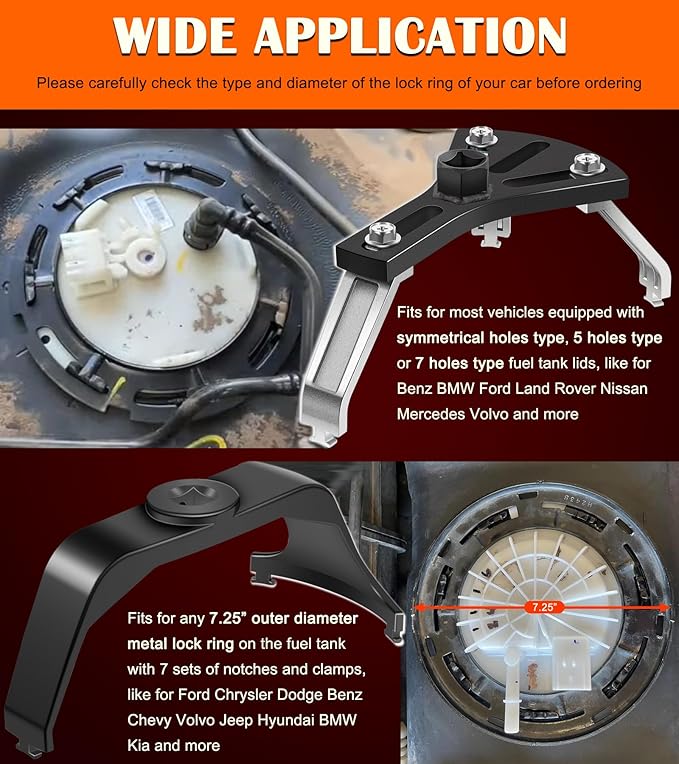 - 【Wide Compatibility】This fuel pump removal and installation tools set is universal for many vehicles, compatible with Ford Chrysler Dodge Chevy BMW Benz Volvo Jeep Mercedes Nissan and so on. (Please refer to the pictures for more specific models)
