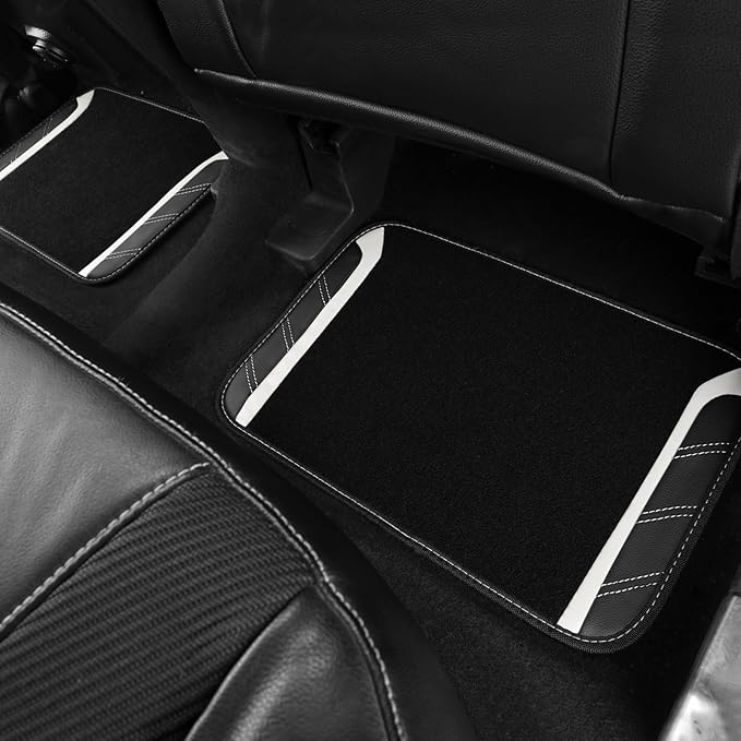 CAR PASS Leather Steering Wheel Cover and Waterproof Car Floor Mats, Microfiber Universal Car Combo Fit for 95% Sedan SUV Van,14.5-15 inch Sporty Anti-Slip Safety Comfortable Design, Black&White