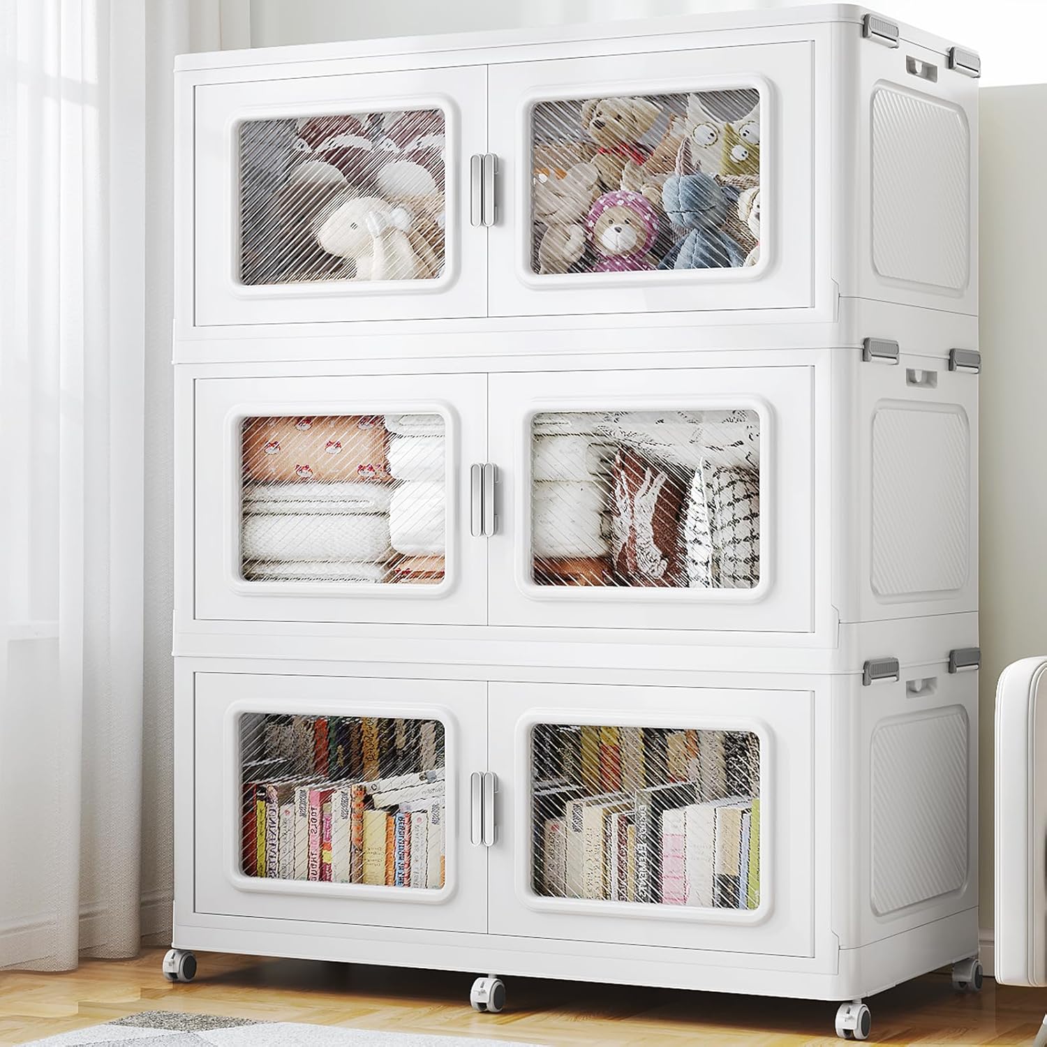 - 【Stackable Design & 360° Rotating Wheels】Our stackable storage bins with wheels design enables secure multi-layer stacking, reinforced by double side 2-buckles and 1 rear buckle for stability. Heavy-duty storage cabinet equipped with 6 TPR-coated 360° swivel wheels for effortless mobility, keeping spaces tidy and organized