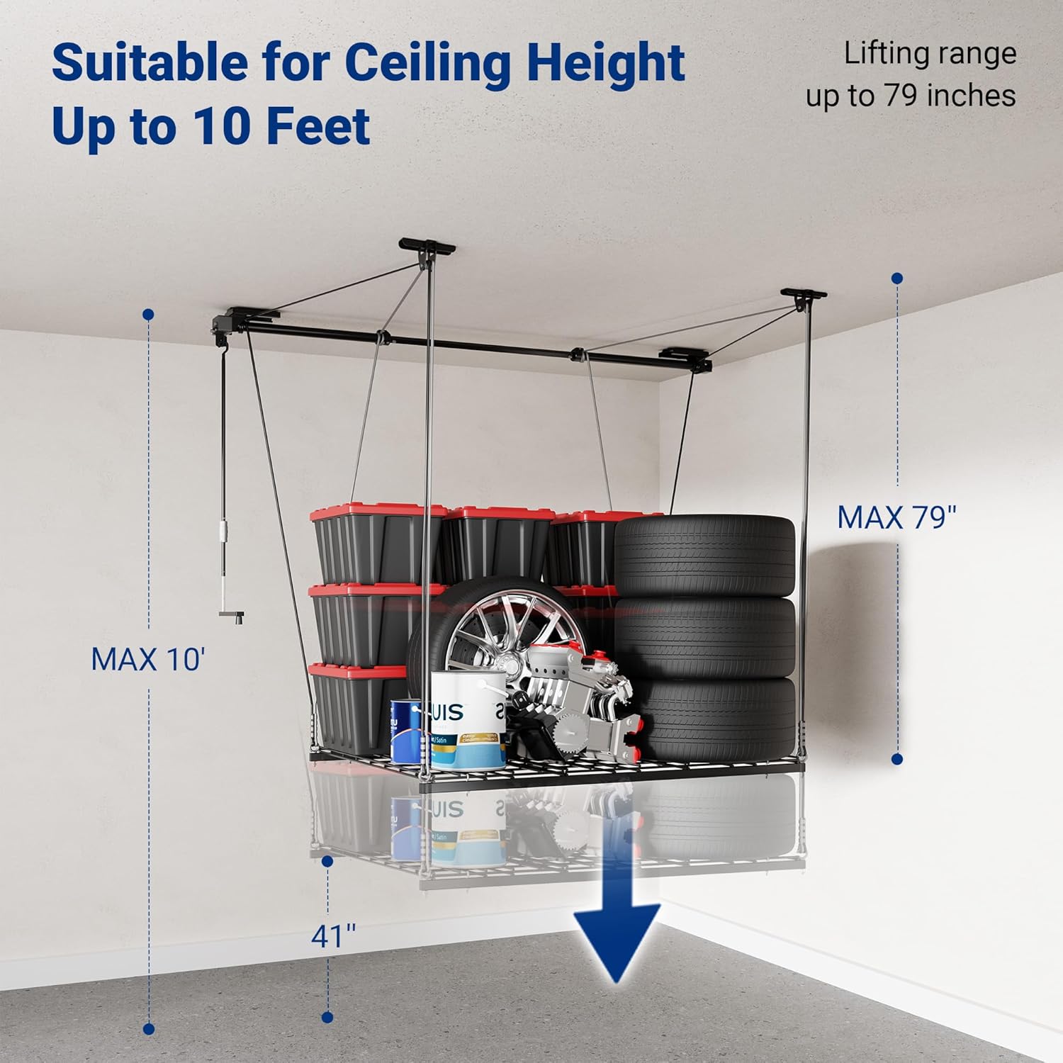 - Lift Design: Easily raise and lower the garage storage rack using the included hand crank or a power drill (not included), eliminating the need for a ladder. The maximum lifting range is 79 inches, suitable for ceiling heights under 10 feet.