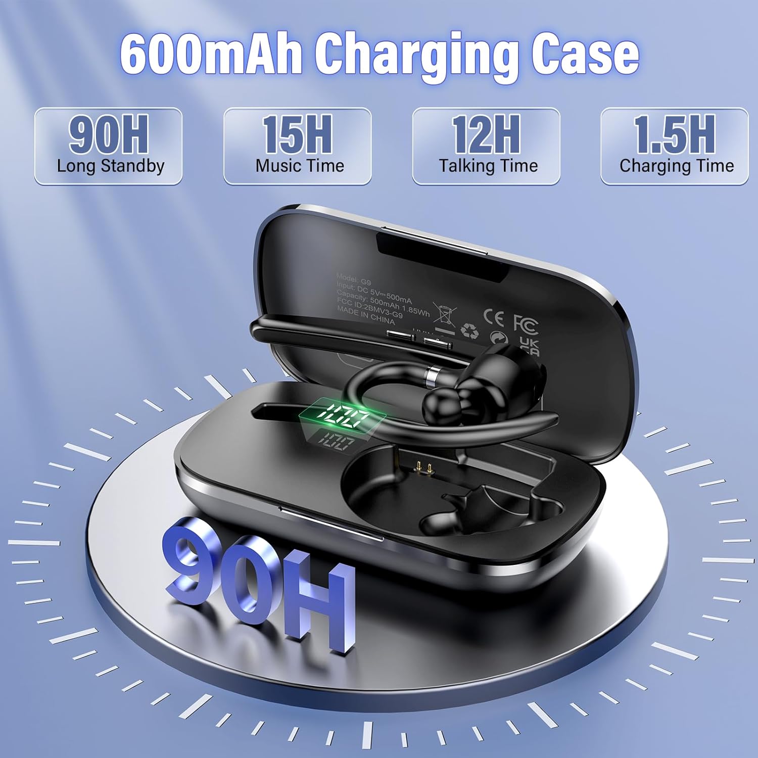 - 90Hrs Marathon Battery & Dual Charging: G9 Hands free noise canceling headphones features a smart LED display, delivering 15hrs nonstop music/12hrs talk time on a 1.5hr charge (via USB-C ports on both earpiece and charging case), plus 90hrs standby – triple the runtime of standard wireless headsets. Built for endurance: this Bluetooth earpiece for iOS, Android, cell phones, laptops powers through long-haul drives, office tasks, and weekend errands – all without battery anxiety.