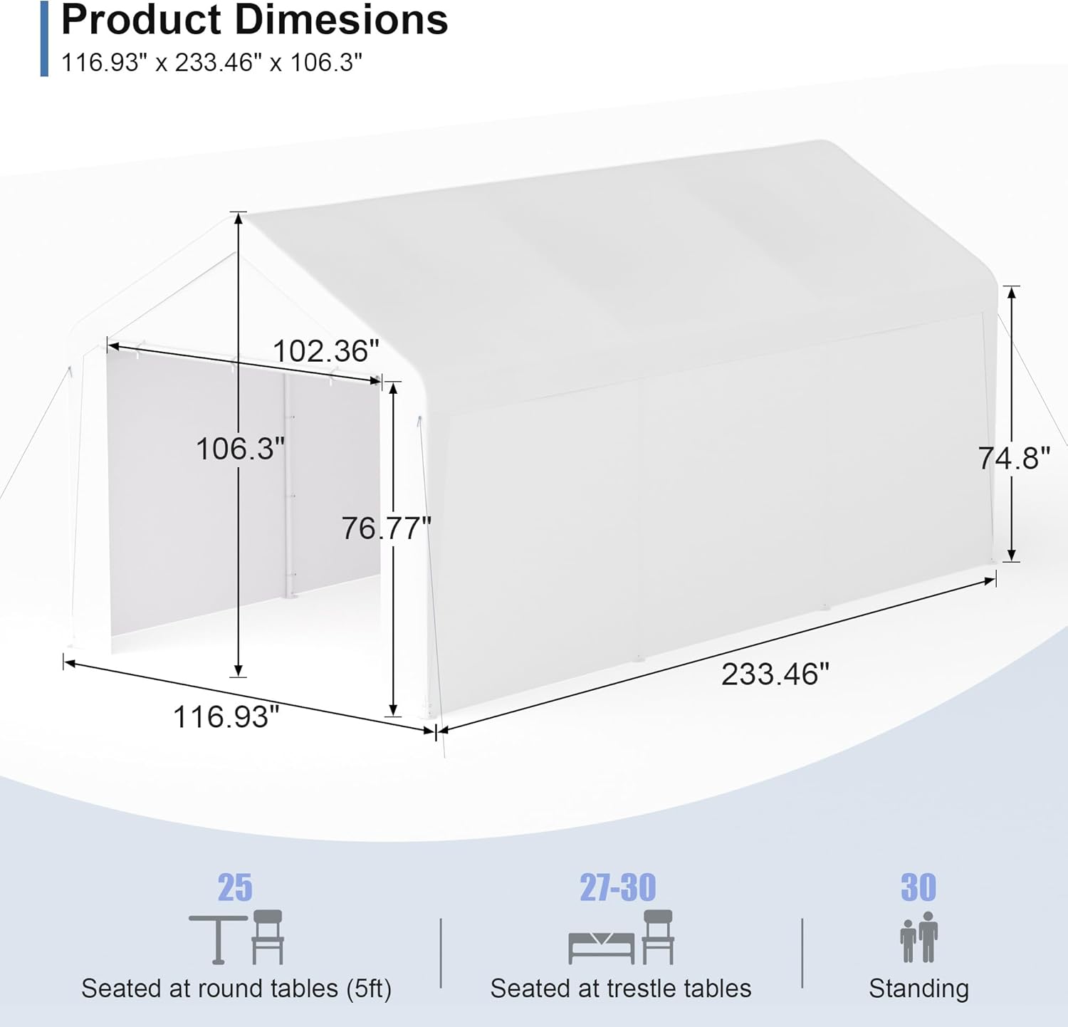 - ALL-WEATHER 10X20 TENT: The carports 10x20 heavy duty is easy to assemble, with a frame articulated by clasps, and can be used to park cars, store equipment, or create a covered area for outdoor events such as weddings, parties, gatherings and more!