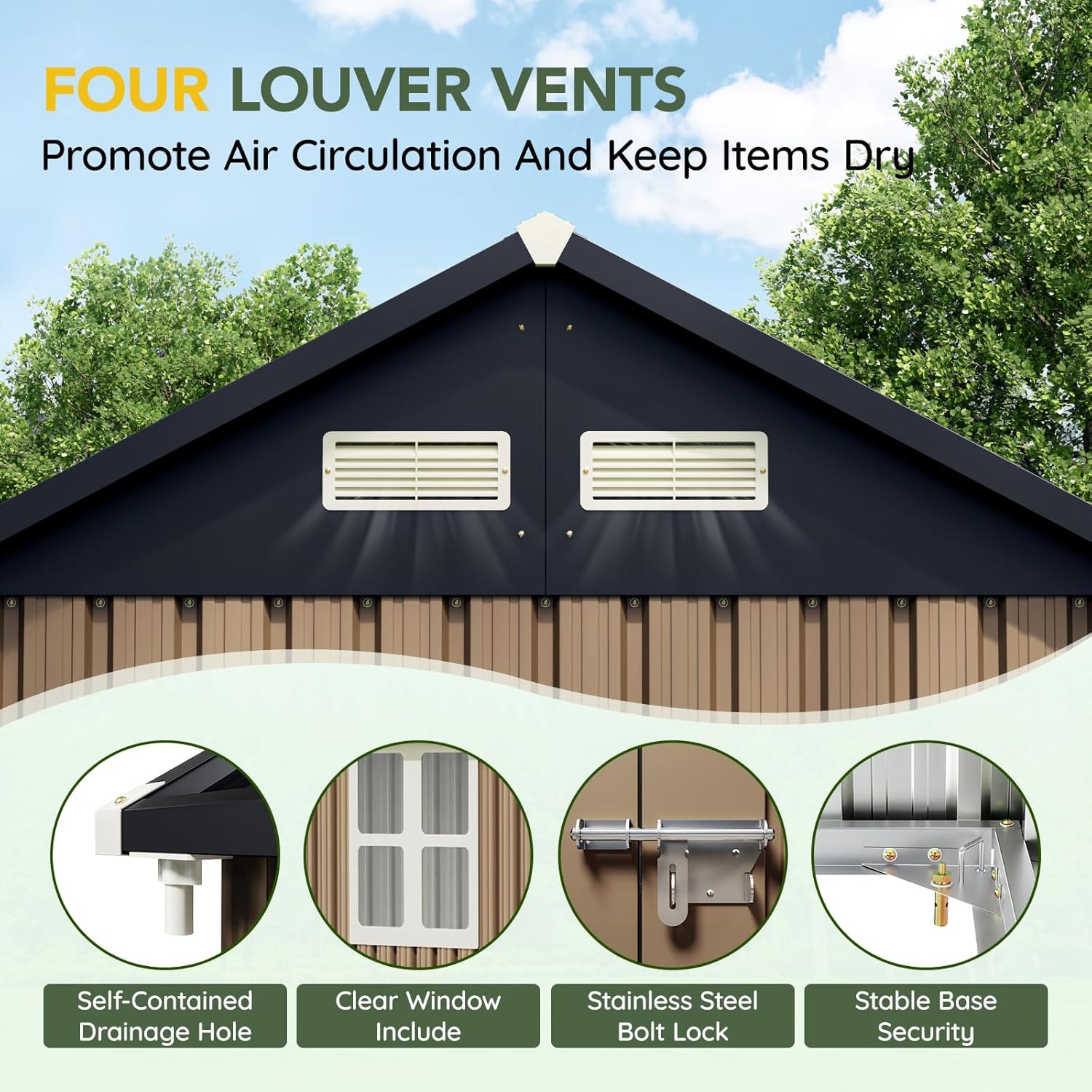 - Durable Construction: Crafted from galvanized steel, this shed is rust-resistant and weatherproof, ensuring long-lasting durability even in tough outdoor conditions.