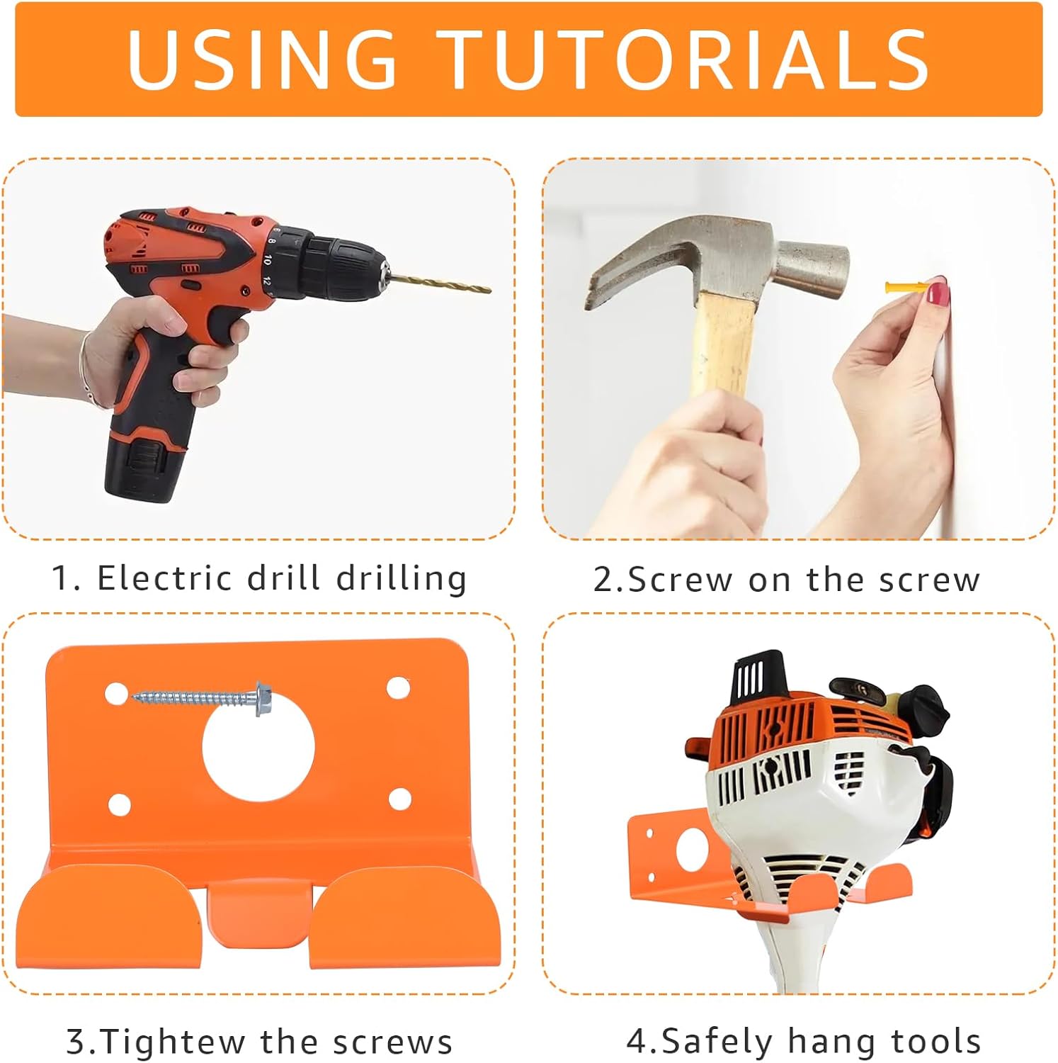 - Complete kit: Purchase the lawnmower hook kit, which includes 2 shelves, 8 screws, and an expansion tube to ensure that the trimmer wall mounted has strong stability and greater balance. It is a good choice for storing and storing tools in garages, gardens, tool rooms, and other places. Reminder: Before installation, measure the thickness of the tool handle and the size of the mounting hole on the bracket, as well as whether it can hang your tool