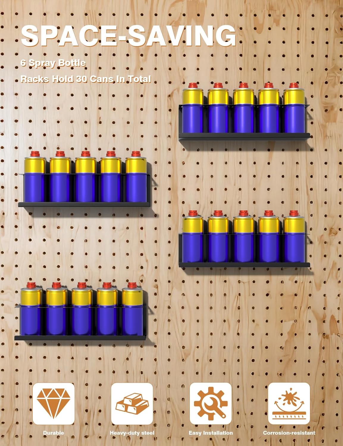 - Save Space - The tool box spray paint can holder can not only be used as a spray bottle rack in the garage, but can also be placed in utility rooms, craft studios, and other places where bottles and cans need to be placed, freeing up space in tool boxes and pantries. The can organizer features an open design for easy storage and access