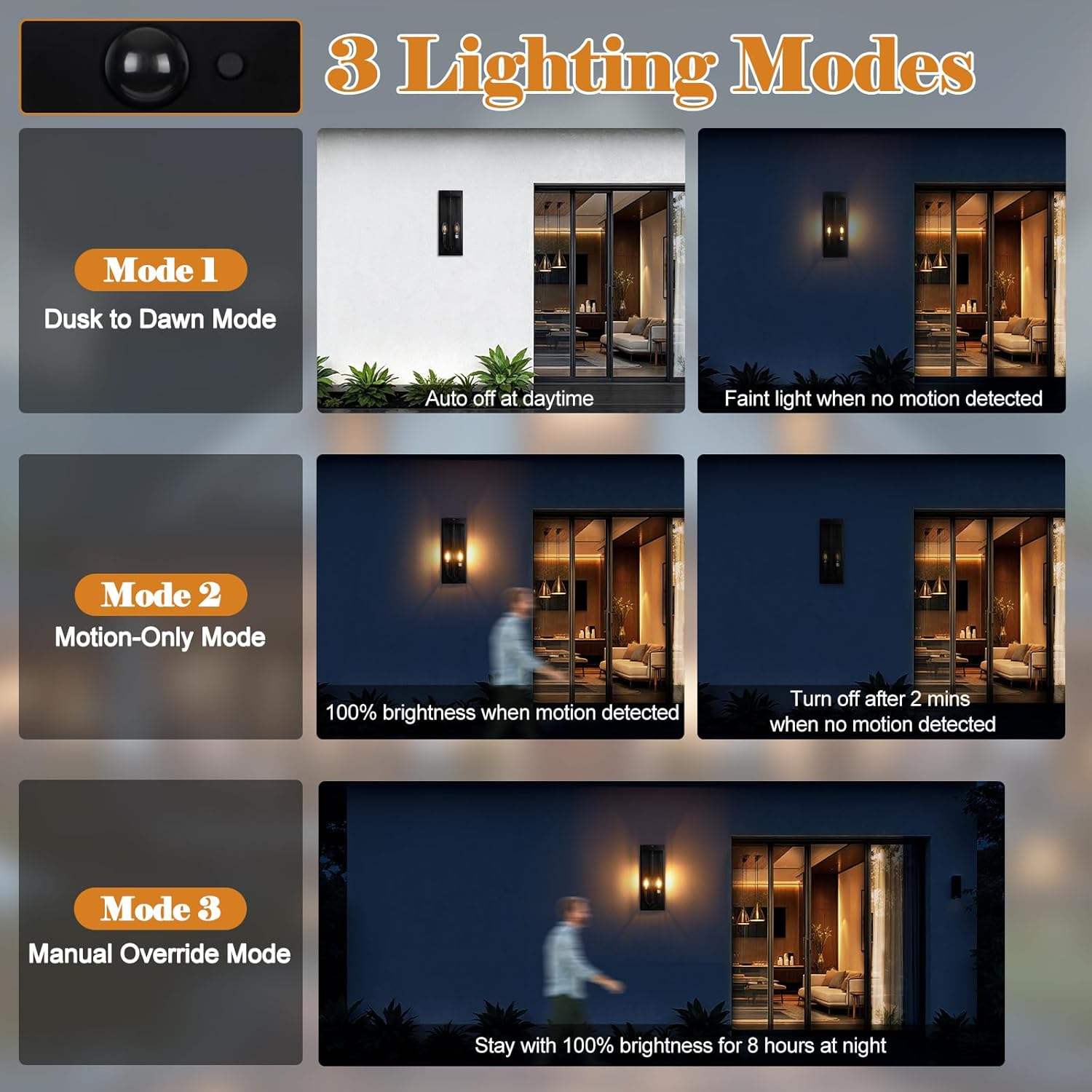 - Motion Activated & Dusk to Dawn Sensor: Our motion sensor exterior lamp has 3 lighting modes: ①Dusk-to-Dawn MODE: 100% brightness when motion detected, revert to dim light after 120s without motion. ②Motion-Only MODE: 100% brightness when motion detected, back to 0% after 120s without motion. ③Manual Override MODE: Keep 100% brightness for 8 hours whole night and auto off at daytime. Free your hand and maximize your electricity savings with our light.