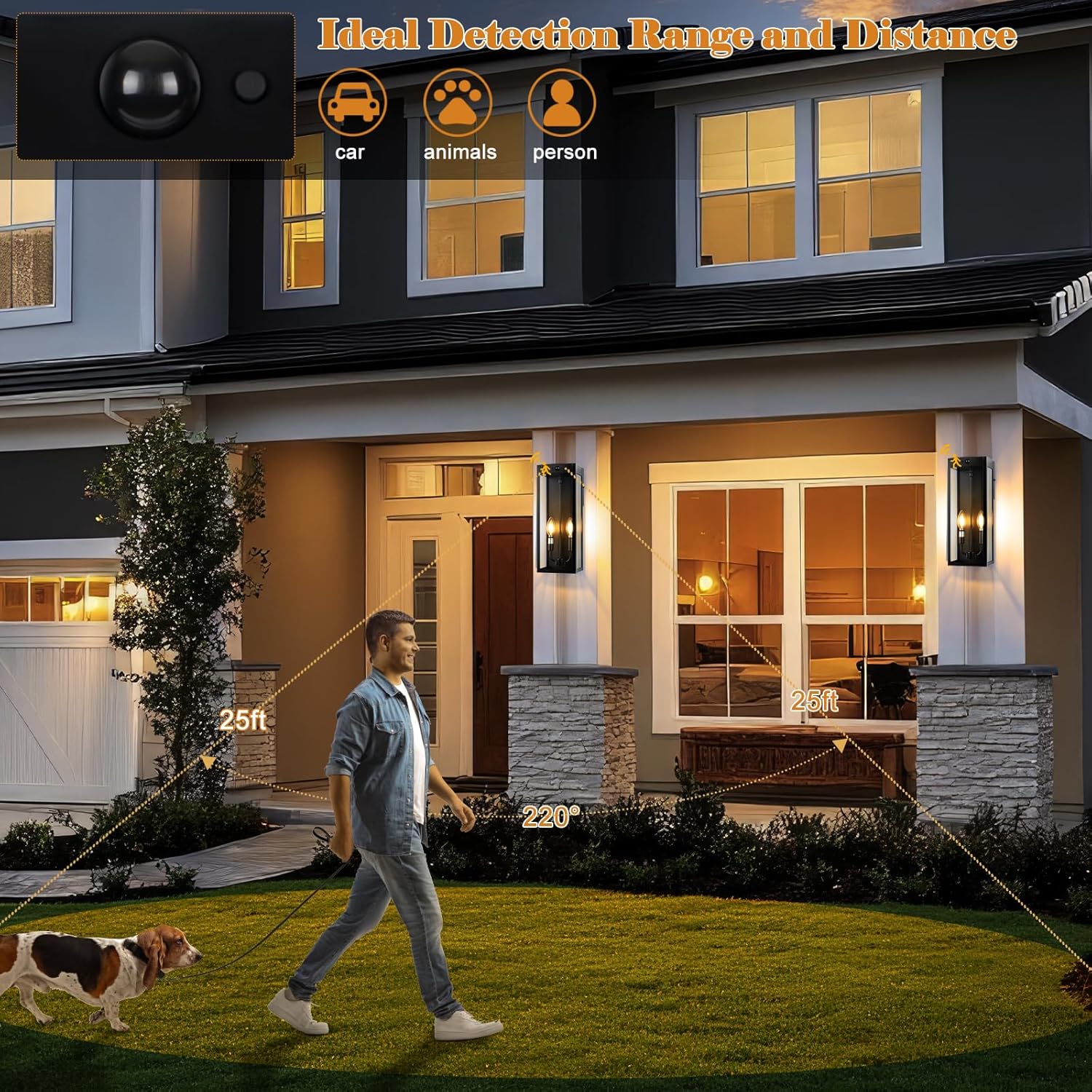 - Weather-Resistant Dusk to Dawn Outdoor Lighting: The modern exterior wall sconce is crafted from premium metal and IP65 waterproof rating clear glass. No fear about terrible weather conditions! These black door lights outside can withstand any weather conditions like cloudy, heavy rain, snowy, icing, hot weather, etc. Our motion exterior garage lights feature 120° wide-angle detection with 25ft range, instantly illuminating pathways when motion is detected. Perfect for outdoor wall mounted lights that combine safety with style.