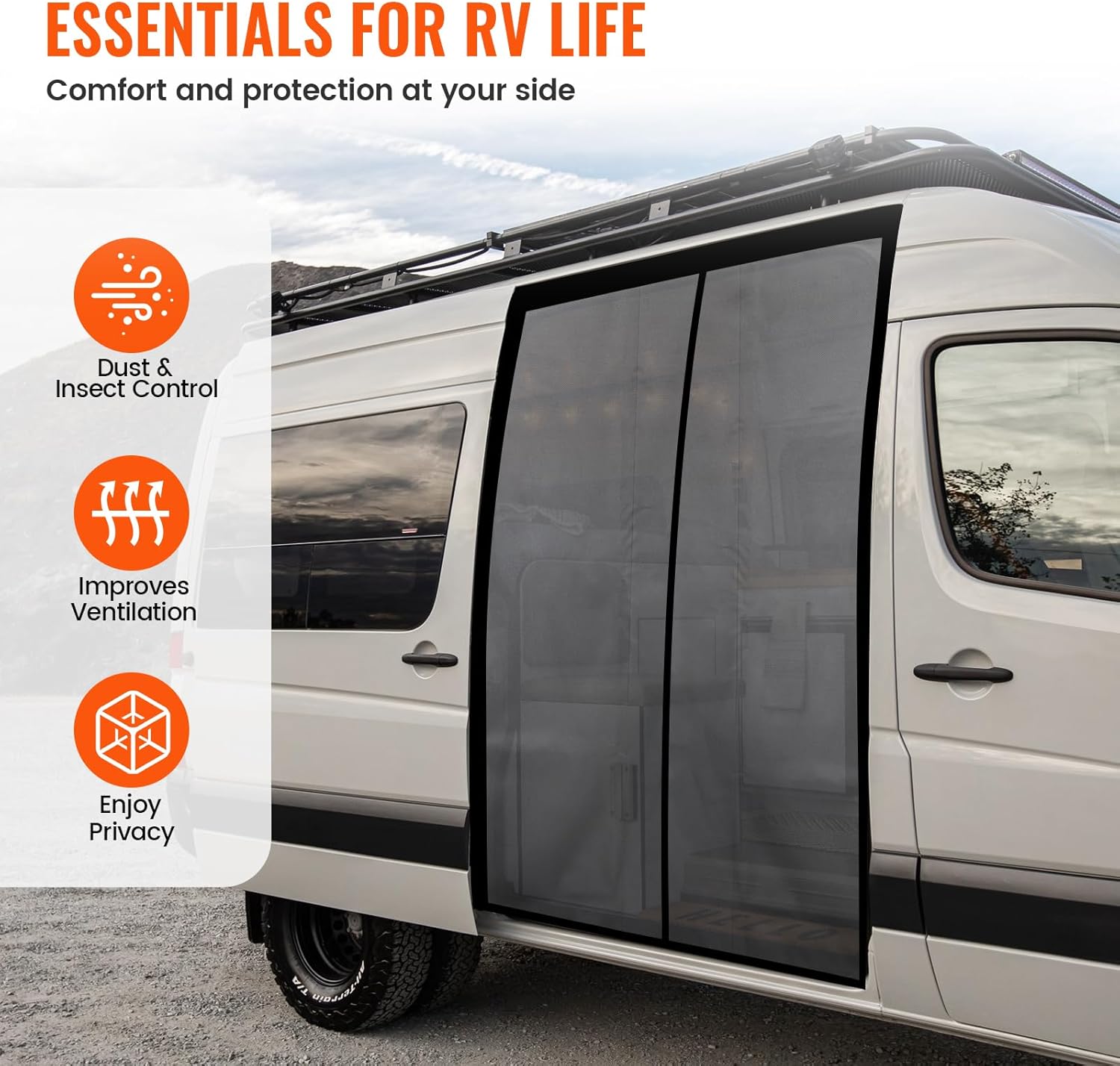 - 【Universal Size】Measuring 71''H x 59''W, this van bug screen fits perfectly on most roof vans, making it an ideal choice for your Mercedes Sprinter standard roof, Ford Transit, Ram Promaster standard/medium/high roof side door. Fits most campervans—simply measure your door opening to ensure a perfect, snug fit.