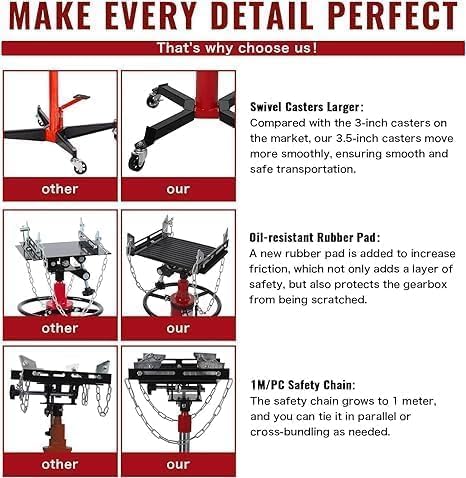 - 360°Swivel Wheels for Effortless Maneuverability:Move seamlessly around tight spaces with four 360° swivel casters, enhanced by a central auxiliary ring for smooth pushing/pulling. This transmission jack with wheels is ideal for transitioning between vehicles or workstations.