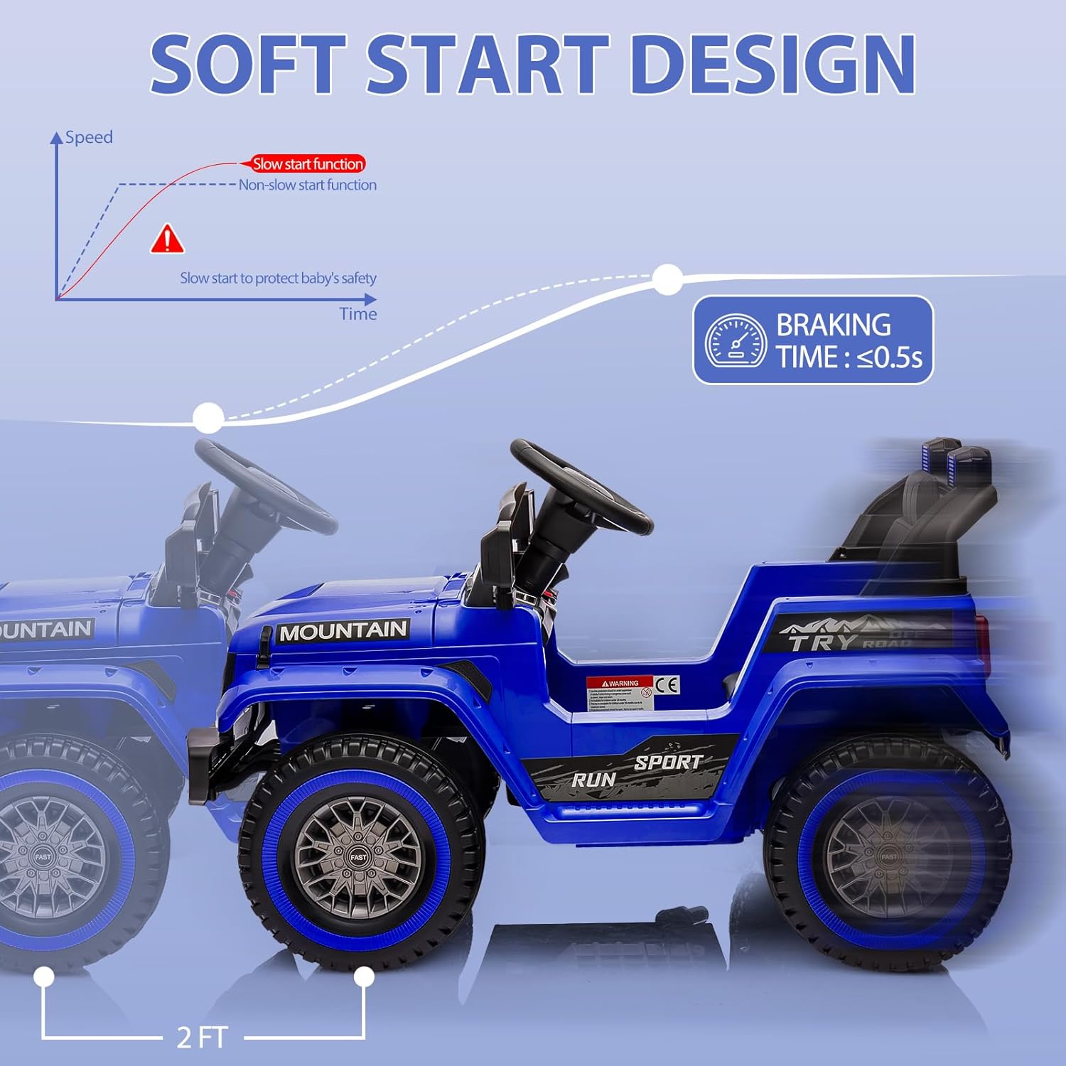 - 【Soft Start & Security Assurance】Anti slip and wear-resistant wheels with shock absorbers ensure smooth and steady driving on the wood floor, brick road or cement road, which gives kids more outdoor driving options. It is worth mentioning that soft start technology of the kid's ride-on car prevents children from being frightened by sudden acceleration or braking.