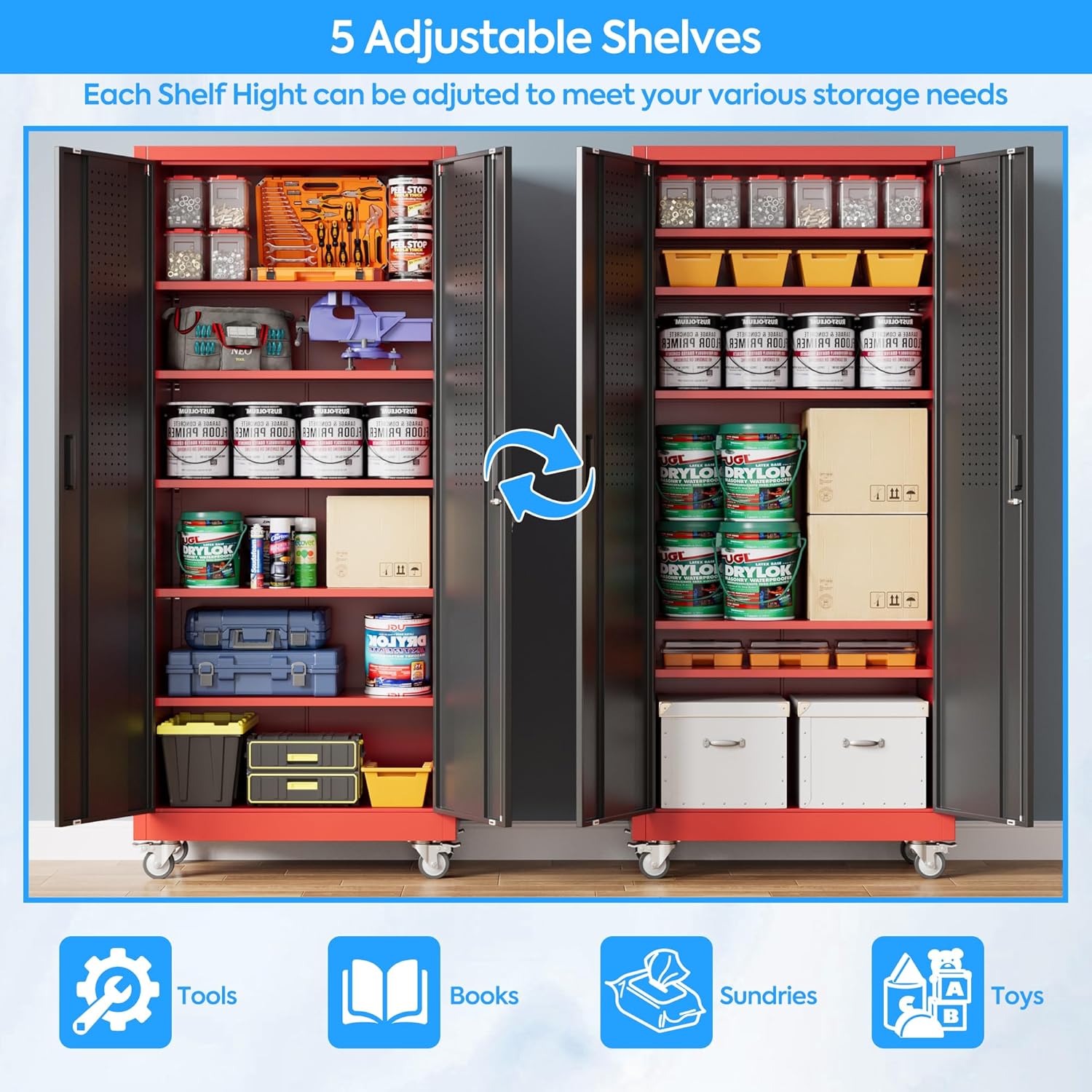 71" H×32" W×16" D Garage Storage Cabinet with Wheels, Locking Metal Storage Cabinet with 5 Adjustable Shelves, 4 Hooks and Pegboard for Garage, Home Office, Kitchen, Black and Red