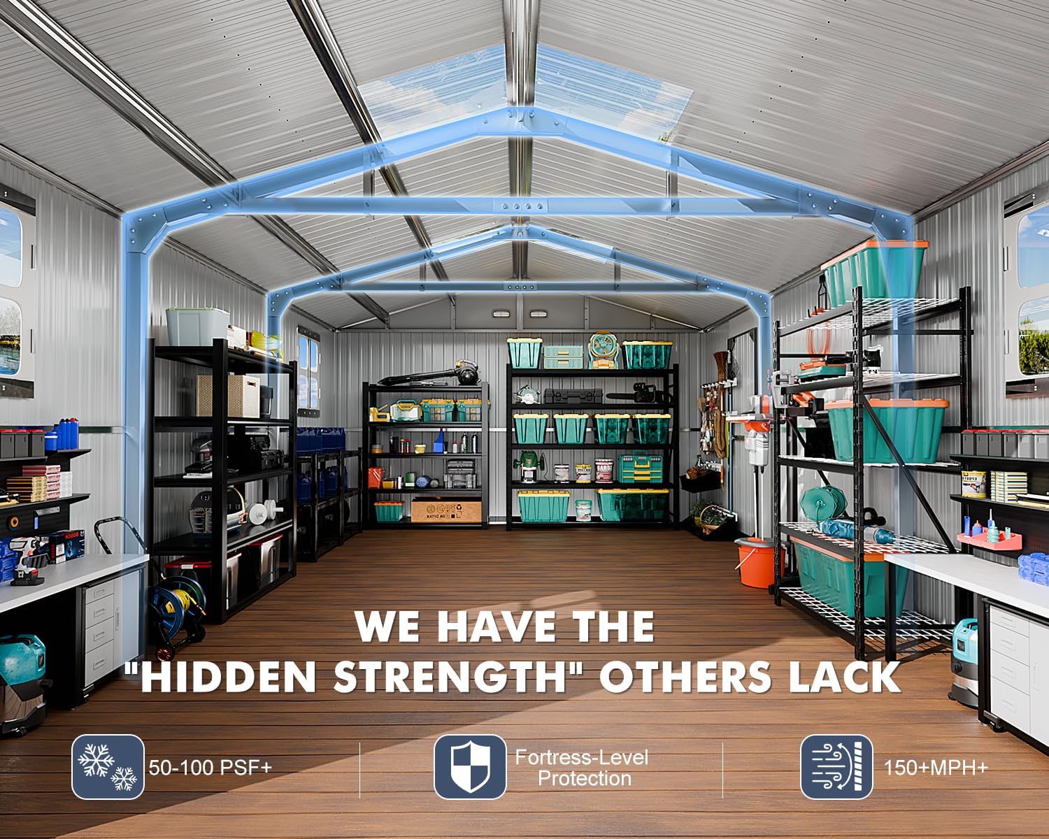 - 🛡️ ALL-WEATHER ARMOR WITH REINFORCED TRUSS SYSTEM: Engineered to endure. Constructed from heavy-duty(23 gauge) , multi-layered galvanized steel and featuring a unique double-reinforced internal truss and beam system(18 Gauge) (see images), this metal building stands defiant against harsh wind, heavy snow, and rain. It’s not just a shed; it's a permanent, weatherproof fortress for your valuables.