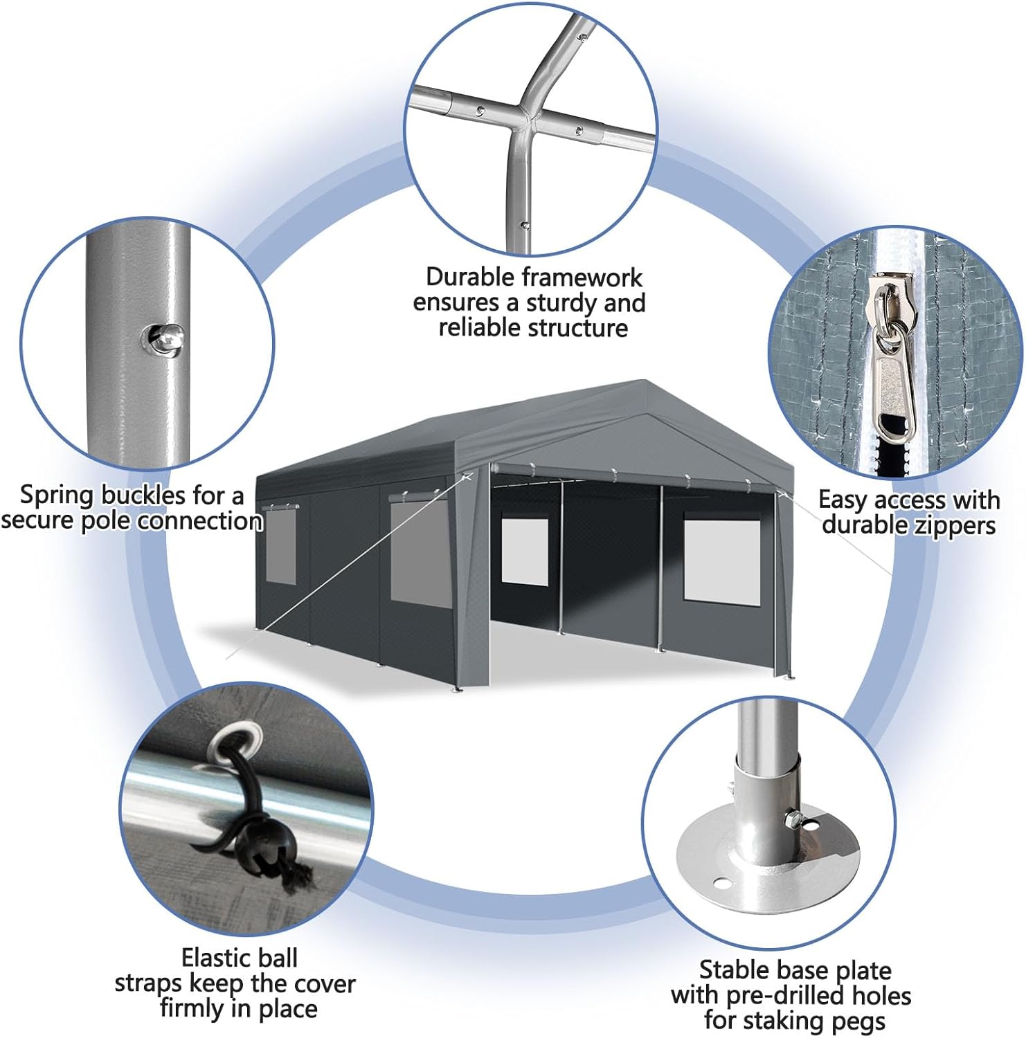- All-Season Car Canopy: This all-weather portable garage features a reinforced triple-layered polyethylene fabric that is tear-proof, waterproof, and UV resistant. The robust canopy attaches firmly to the frame via high-quality elastic ball straps and secure buckles, delivering year-round protection for vehicles and stored items