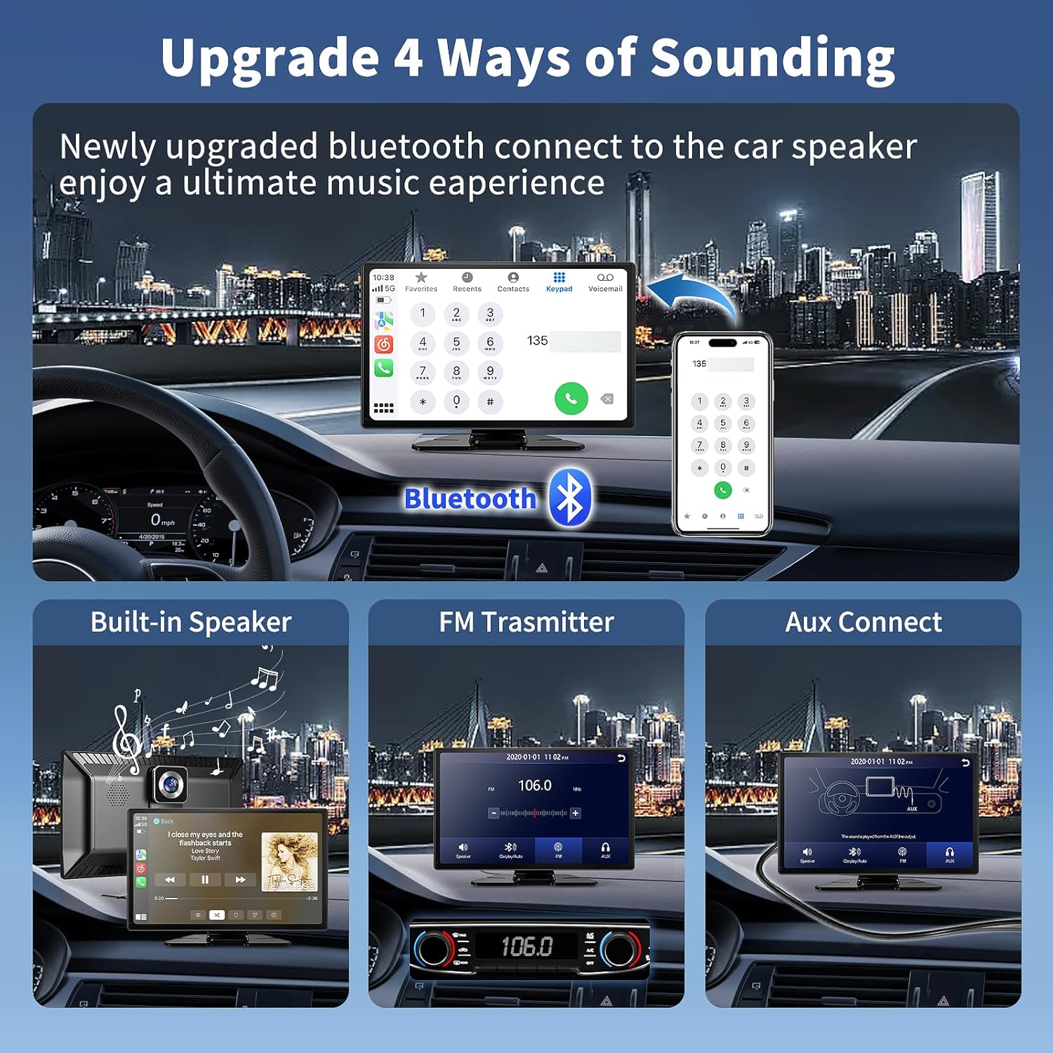 - 【Stable Bluetooth 5.0 & FM Transmission & AUX Cable】The car play screen for my car plug in features Bluetooth 5.0 for a more stable connection, and listens to the radio, weather forecasts and news in real-time. This portable carplay screen equipped with a built-in speaker. For louder sound, effortlessly stream audio to your car's factory speakers via Bluetooth Connection (via Carplay or Android Auto), FM transmission, or AUX cable. Versatile Audio Integration for Ultimate Entertainment.