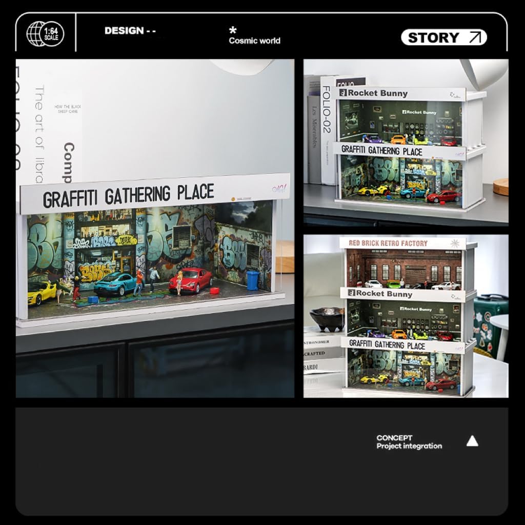 Display Case for Hot Wheels: Stackable Parking Garage for 1/64 Scale Matchbox Toy Car, FoamBoard Storage for Monster Trucks with LED Light and Acrylic Cover, 2025 Upgraded Graffiti Wall